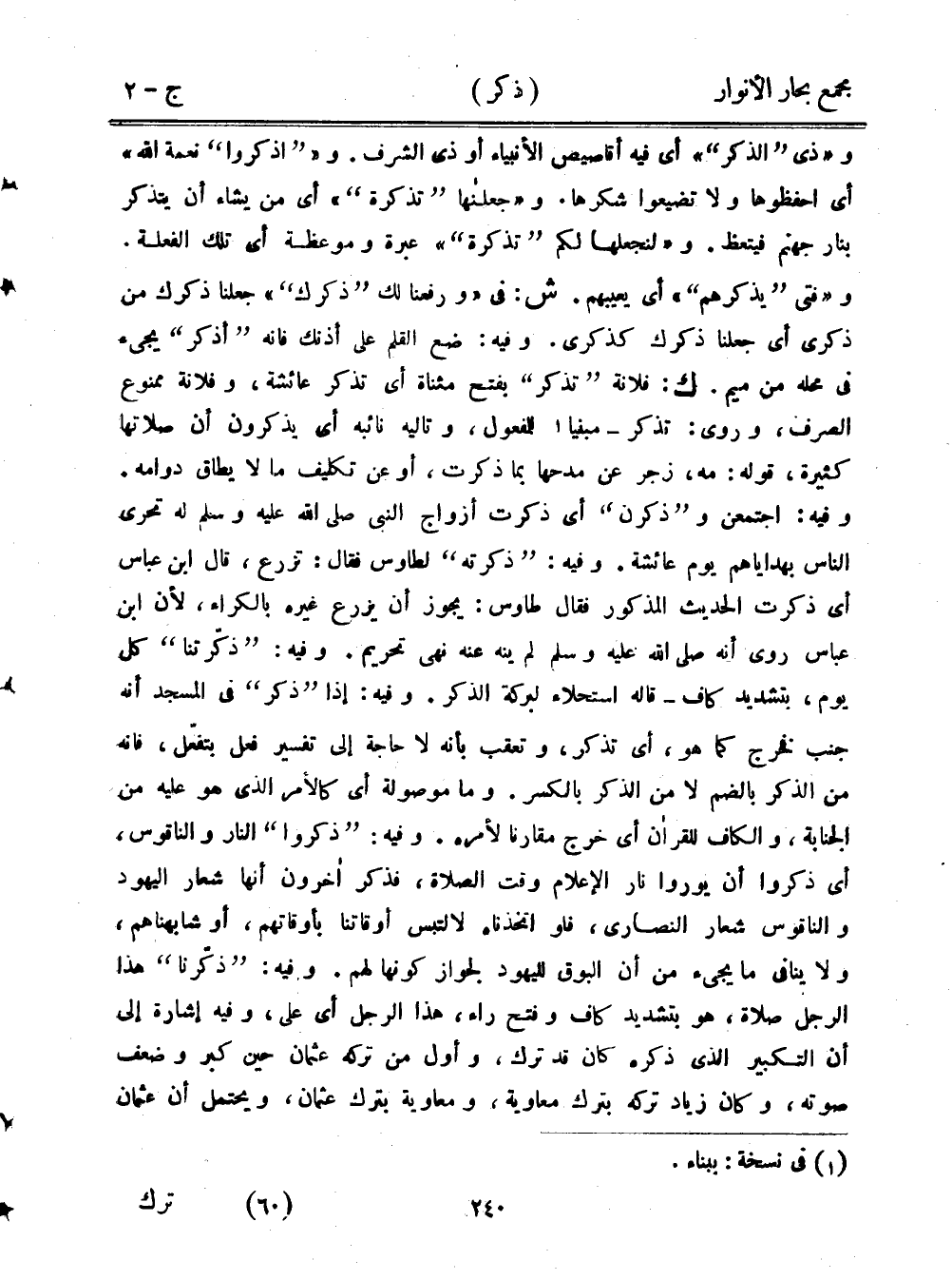 و"ذي "الذكر"" أي فيه أقاصيص الأنبياء أو ذي الشرف. و""اذكروا" نعمة الله" أي احفظوها ولا تضيعوا شكرها. و"جعلناها "تذكرة"" أي من يشاء أن يتذكر بنار جهنم فيتعظ. و"جعلناها "تذكرة"" أي من يشاء أن يتذكر بنار جهنم فيتعظ. و"لنجعلها لكم "تذكرة"" عبرة وموعظة أي تلك الفعلة. و"فتى "يذكرهم"" أي يعيبهم. ش: في "ورفعنا لك "ذكرك"" جعلنا ذكرك من ذكرى أي جعلنا ذكرك كذكرى. وفيه: ضع القلم على أذنك فإنه "أذكر" يجيء في محله من ميم. ك: فلانة "تذكر" بفتح مثناة أي تذكر عائشة، وفلانة ممنوع الصرف، وروى: تذكر - مبنيًا للمفعول، وتاليه نائبه أي يذكرون أن صلاتها كثيرة، قوله: مه، زجر عن مدحها بما ذكرت، أو عن تكليف ما لا يطاق دوامه. وفيه: اجتمعن و"ذكرن" أي ذكرت أزواج النبي صلى الله عليه وسلم له تحرى الناس بهداياهم يوم عائشة. وفيه: "ذكرته" لطاوس فقال تزرع، قال ابن عباس أي ذكرت الحديث المذكور فقال طاوس: يجوز أن يزرع غيره بالكراء، لأن ابن عباس روى أنه صلى الله عليه وسلم لم ينه عنه نهي تحريم. وفيه: "ذكرتنا" كل يوم، بتشديد كاف - قاله استحلاء لبركة الذكر. وفيه: إذا "ذكر" في المسجد أنه جنب فخرج كما هو، أي تذكر، وتعقب بأنه لا حاجة إلى تفسير فعل يتفعل، فإنه من الذكر بالضم لا من الذكر بالكسر. وما موصولة أي كالأمر الذي هو عليه من الجنابة، والكاف للقرآن أي خرج مقارنًا لأمره. وفيه: "ذكروا" النار والناقوس، أي ذكروا أن يوروا نار الإعلام وقت الصلاة، فذر أخرون أنها شعار اليهود والناقوس شعار النصارى، فلو اتخذناه لالتبس أوقاتنا بأوقاتهم، أو شابهناهم، ولا ينافي ما يجيء من أن البوق لليهود لجواز كونها لهم. وفيه: "ذكرنا" هذا الرجل صلاة، هو بتشديد كاف وفتح راء، هذا الرجل أي على، وفيه إشارة إلى أن التكبير الذي ذكره كان قد ترك، وأول من تركه عثمان حين كبر وضعف صوته، وكان زياد تركه بترك معاوية، ومعاوية بترك عثمان، ويحتمل أن عثمان
