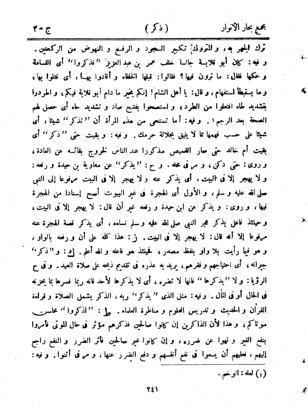 ترك الجهر به، والمتروك تكبير السجود والرفع والنهوض من الركعتين. وفيه: كان أبو قلابسة جالسًا خلف عمر بن عبد العزيز "فذكروا" أي القسامة وحكمها فقال: ما ترون فيها؟ فقالوا: قبلها الخلفاء وأقادوا بها، أي قتلوا بها، وما يستنبطا استفهام، وقال: يا أهل الشام! إنكم بخير ما دام أبو قلابة فيكم، واطردوا بتشديد طاء افتعلوا من الطرد، واستصحوا بفتح صاد وتشديد حاء أي حصل لهم الصحة بعد الرجم. وفيه: أما تستحي من هذه المرأة أن "تذكر" شيئًا، أي شيئًا على حسب فهمها مما لا يليق بجلالة حرمك. وفيه: وبقيت حتى "ذكر" أي بقيت أم خالد حتى صار القميص مذكورًا عند الناس لخروج بقائه عن العادة، وروى: حتى دكن، ومر في محله. وح: "يذكر" عن معاوية بن حيدة ورفعه: ولا يهجر إلا في البيتين أي يذكر عنه ولا يهجر لا في البيت مرفوعًا إلى النبي صلى الله عليه وسلم، والأول أي الهجرة في غير البيوت أصح إسنادًا من الهجرة فيها، وروى: ويذكر عن ابن حيدة ورفعه غير أن قال: لا يهجر إلا في البيت، وحينئذ فاعل يذكر هجر النبي صلى الله عليه وسلم نساءه، أي يذكر قصة الهجرة عنه مرفوعًا إلا أنه قال: لا يهجر إلا في البيت. ز: هذا كله على أن ورفعه بالواو، وهو فيما رأيت بلا واو بلفظ مصدر، فحينئذ هو فاعله والله أعلم. ك: و"ذكر" جيرانه، أي احتياجهم وفقرهم، يريد به عذره في تقديم ذبحه على صلاة العيد. وفي ح الرؤيا: ولا "يذكرها" فإنها لا تضره، أي لا يذكرها لأحد فإنه ربما فسرها بما يحزنه في الحال أو في المال. وفيه: مثل الذي "يذكر" ربه، الذكر يشمل الصلاة وقراءة القرآن والحديث وتدريس العلوم ومناظرة العلماء. ط: "اذكروا" محاسن موتاكم، وهذا لأن الذاكرين إن كانوا صالحين فذكرهم مؤثر في حال الموتى فأمروا ينفع الغير ونهوا عن ضرره، وإن كانوا غير صالحين فأثر الضرر والنفع راجع إليهم، فعليهم أن يسعوا في نفع أنفسهم ودفع الضرر عنها، ومر في أثنوا. وفيه: