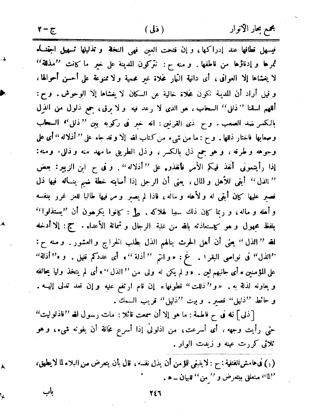 فيسهل قطافها عند إدراكها، وإن فتحت العين فهي النخلة وتذليلها تسهيل اجتناء ثمرها وإدناؤها من قاطفها. ومنه ح: تتركون المدينة على خير ما كانت "مذللة" لا يغشاها إلا العوافي، أي دانية الثمار مخلاة غير محمية ولا ممنوعة على أحسن أحوالها، وقيل أراد أن المدينة تكون مخلاة خالية عن السكان لا يغشاها إلا الوحوش. وح: أللهم اسقنا "ذلل" السحاب، هو الذي لا رعد فيه ولا برق، جمع ذلول من الذل بالكسر ضد الصعب. وح ذي القرنين: أنه خير في ركوبه بين "ذلل" السحاب وصعابها فاختار ذللها. وح: ما من شيء من كتاب الله إلا وقد جاء على "أذلاله" أي على وجوهه وطرقه، وهو جمع ذل بالكسر، وذل الطريق ما مهد منه وذلل. ومنه: إذا رأيتموني أنفذ فيم الأمر فأنفذوه على "أذلاله". وفي ح ابن الزبير: بعض "الذل" أبقى للأهل والمال، يعني أن الرجل إذا أصابته خطة ضيم يناله فيها ذل فصبر عليها كان أبقى له ولأهله وماله، فإذا لم يصبر ومر فيها طالبًا للعز غرر بنفسه وأهله وماله، وربما كان ذلك سببًا لهلاكه. ط: كانوا يكرهون أن "يستذلوا" بلفظ مجهول وهو كاستعاذته بالله من غلبة الرجال وشماتة الأعداء. ج: إلا أدخله الله "الذل" يعني أن أهل الحرث ينالهم الذل بطلب الخراج والعشور. ومنه ح: "الذل" في نواصي البقر. غ: طوانتم "أذلة"" أي عددكم قليل. و"أذلة" على المؤمنين" أي جانبهم لين. "ولم يكن له ولي من "الذل"" أي لم يتخذ وليًا يحالفه ويعاونه لذلة به. "و"ذللت" قطوفها" ن قام ارتفع عليه وإن قعد تدلى إليه. وحائط "ذليل" قصير. وبيت "ذليل" قريب السمك.