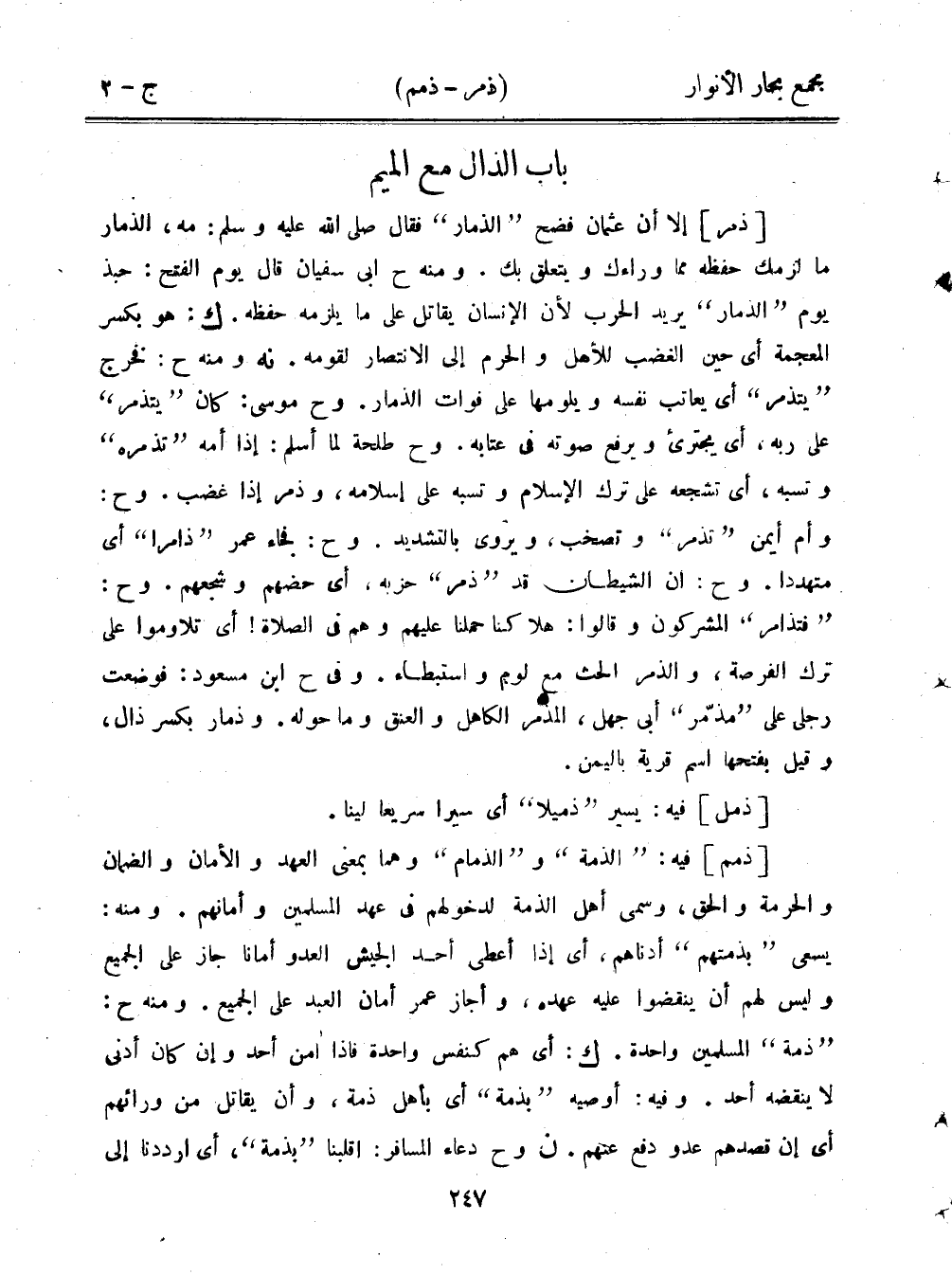 [ذمر] إلا أن عثمان فضح "الذمار" فقال صلى الله عليه وسلم: مه، الذمار ما لزمك حفظه مما وراءك ويتعلق بك. ومنه ح أبي سفيان قال يوم الفتح: حبذ يوم "الذمار" يريد الحرب لأن الإنسان يقاتل على ما يلزمه حفظه. ك: هو بكسر المعجمة أي حين الغضب للأهل والحرم إلى الانتصار لقومه. نه ومنه ح: فخرج "يتذمر" أي يعابت نفسه ويلومها على فوات الذمار. وح موسى: كان "يتذمر" على ربه، أي يجتريء ويرفع صوته في عتابه. وح طلحة لما أسلم: إذا أمه "تذمره" وتسبه، أي تشجعه على ترك الإسلام وتسبه على إسلامه، وذمر إذا غضب. وح: وأم أيمن "تذمر" وتصخب، ويروى بالتشديد. وح: فجاء عمر "ذامرًا" أي متهددًا. وح: أن الشيطان قد "ذمر" حزبه، أي حضهم وشجعهم. وح: "فتذامر" المشركون وقالوا: هلاكنا حملنا عليهم وهم في الصلاة! أي تلاوموا على ترك الفرصة، والذمر الحث مع لوم واستبطاء. وفي ح ابن مسعود: فوضعت رجلي على "مذمر" أبي جهل، المذمر الكاهل والعنق وما حوله، وذمار بكسر ذال، وقيل بفتحها اسم قرية باليمن.