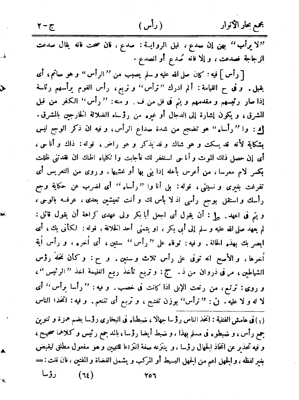 [رأس] فيه: كان صلى الله عليه وسلم يصيب من "الرأس" وهو صائم، أي يقبل. وفي ح القيامة: ألم أدرك "ترأس" وتربع، رأس القوم يرأسهم رئاسة إذا صار رئيسهم ومقدمهم ويتم في فل من ف. ومنه: "رأس" الكفر من قبل المشرق، ويكون إشارة إلى الدجال أو غيره من رؤساء الضلالة الخارجين بالمشرق، ك: وا"رأساه" هو تضجع من شدة صداع الرأس، وفيه أن ذكر الوجع ليس بشكاية لأنه قد يسكت وهو شاك وقد يذكر وهو راض، قوله: ذاك وأناحي، أي إن حصل ذلك الموت وأناحي استغفر لك فأجابت واتكلياه أظنك أن فقدتني ظللت بكسر لام معرسًا، من أعرس بأهله إذا بنى بها أو غشيها، وروى من التعريس أي تفرغت بغيري ونسيتني، قوله: بل أنا وا"رأساه" أي اضرب عن حكاية وجع رأسك واستقل بوجع رأسي إذا لا بأس لك وأنت تعيشين بعدي، عرفه بالوحي، ويتم في اعهد. ط: أن يقول أي اجعل أبا بكر ولي عهدي كراهة أن يقول قائل: لم يعهد صلى الله عليه وسلم إلى أبي بكر، أو يتمنى أحد الخلافة، قوله: لكأني بك، أي ابصر بك بهذه الحالة. وفيه: توفاه على "رأس" ستين، أي أخره، ورأس أية أخرها، والأصح أنه توفى على رأس ثلاث وستين. وح: وكأن نخله رؤس الشياطين، مر في ذروان من ذ. ج: وتربع تأخذ ربع الغنيمة أخذ "الرئيس"، وروى: ترتع، من رتعت الإبل إذا كانت في خصب. وفيه: "رأسًا برأس" أي لا له ولا عليه. ن: "ترأس" بوزن تفتح، وتربع أي تتنعم. وفيه: اتخذا الناس