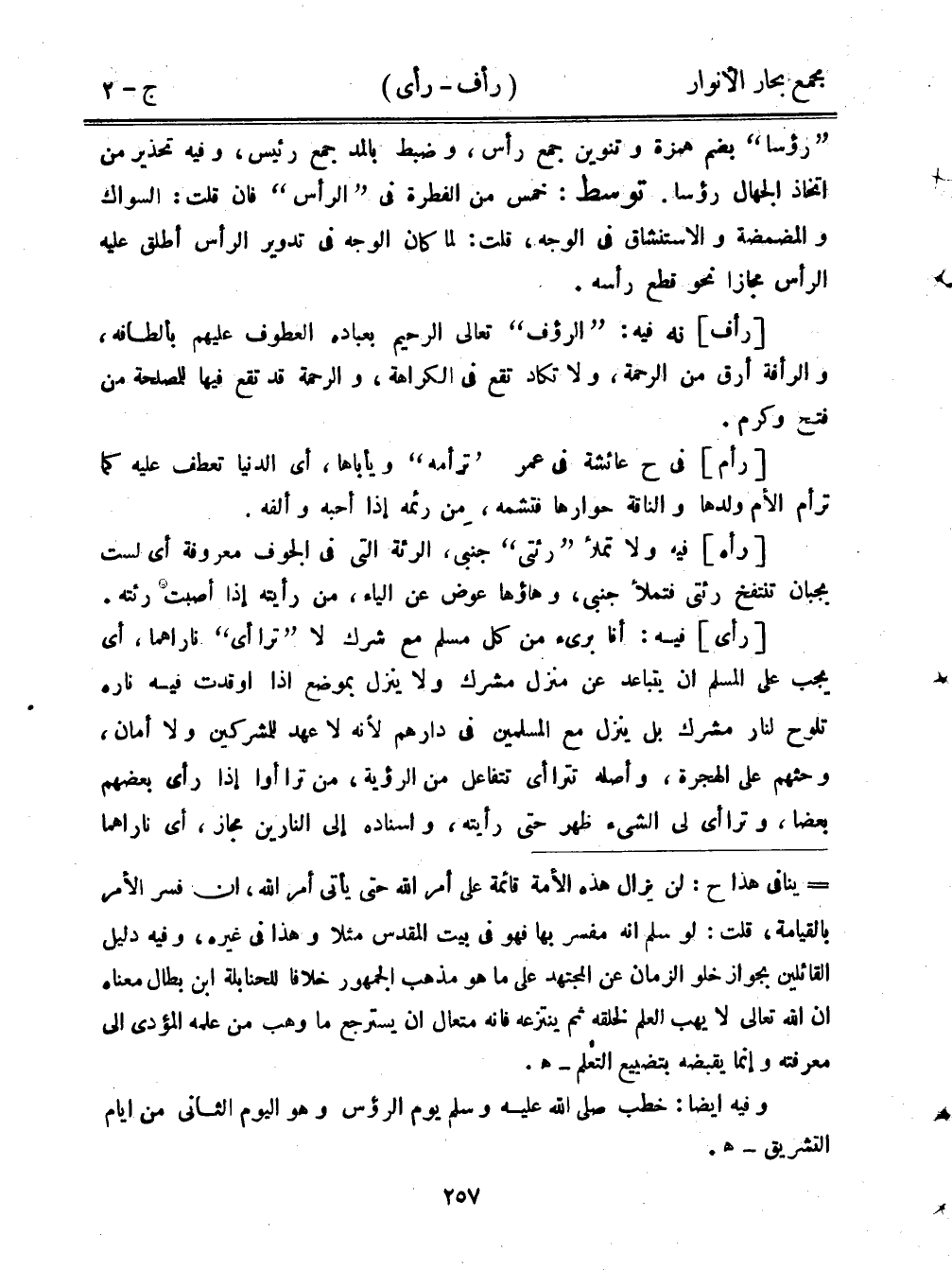 [رأى] فيه: أنا بريء من كل مسلم مع شرك لا "ترا أي" ناراهما، أي يجب على المسلم أن يتباعد عن منزل مشرك ولا ينزل بموضع إذا أوقدت فيه ناره تلوح لنار مشرك بل ينزل مع المسلمين في دارهم لأنه لا عهد للمشركين ولا أمان، وحثهم على الهجرة، وأصله تتراأي تتفاعل من الرؤية، من ترا أوا إذا رأى بعضهم بعضا، وترا أي لي الشيء ظهر حتى رأيته، واسناده إلى النارين مجاز، أي ناراهما