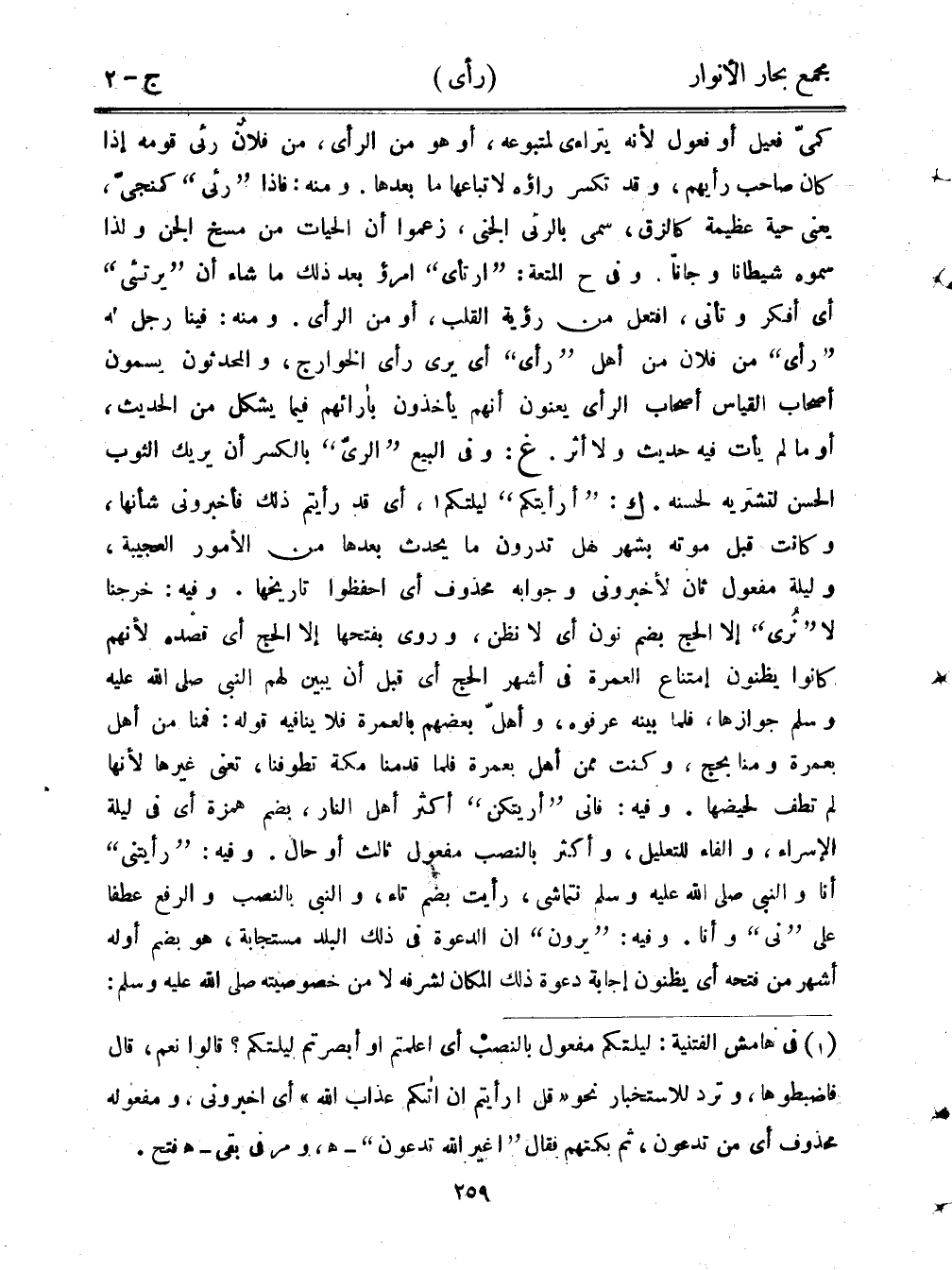 كميّ فعيل أو فعول لأنه يتراءى لمتبوعه، أو هو من الرأي، من فلان رئي قومه إذا كان صاحب رأيهم، وقد تكسر راؤه لاتباعها ما بعدها. ومنه: فإذا "رئى" كمنجى، يعني حية عظيمة كالزق، سمى بالرئى الجني، زعموا أن الحيات من مسخ الجن ولذا سموه شيطانًا وجانا. وفي ح المتعة: "ارتأى" امرؤ بعد ذلك ما شاء أن "يرتئ" أي أفكر وتأنى، وافتعل من رؤية القلب، أو من الرأي. ومنه: فينا رجل له "رأى" من فلان من أهل "رأى" أي يرى رأي الخوارج، والمحدثون يسمون أصحاب القياس أصحاب الرأي يعنون أنهم يأخذون بآرائهم فيما يشكل من الحديث، أو ما لم يأت فيه حديث ولا أثر. غ: وفي البيع "الري" بالكسر أن يريك الثوب الحسن لتشتريه لحسنه. ك: "أرأيتكم" ليلتكم، أي قد رأيتم ذلك فأخبروني شأنها، وكانت قبل موته بشهر هل تدرون ما يحدث بعدها من الأمور العجيبة، وليلة مفعول ثان لأخبروني وجوابه محذوف أي احفظوا تاريخها. وفيه: خرجنا لا "نُرى" إلا الحج بضم نون أي لا نظن، وروى بفتحها إلا الحج أي قصده لأنهم كانوا يظنون إمتناع العمرة في أشهر الحج أي قبل أني بين لهم النبي صلى الله عليه وسلم جوازها، فلما بينه عرفوه، وأهل بعضهم بالعمرة فلا ينافيه قوله: فمنا من أهل بعمرة ومنا بحج، وكنت ممن أهل بعمرة فلما قدمنا مكة تطوفنا، تعني غيرها لنها لم تطف لحيضها. وفيه: فإنى "أريتكن" أكثر أهل النار، بضم همزة أي في ليلة الإسراء، والفاء للتعليل، وأكثر بالنصب مفعول ثالث أو حال. وفيه: "رأيتني" أنا والنبي صلى الله عليه وسلم نتماشى، رأيت بضم تاء، والنبي بالنصب والرفع عطفًا على "ني" ونا. وفيه:"يرون" أن الدعوة في ذلك البلد مستجابة، هو بضم أوله أشهر من فتحه أي يظنون إجابة دعوة ذلك المكان لشرفه لا من خصوصيته صلى الله عليه وسلم: