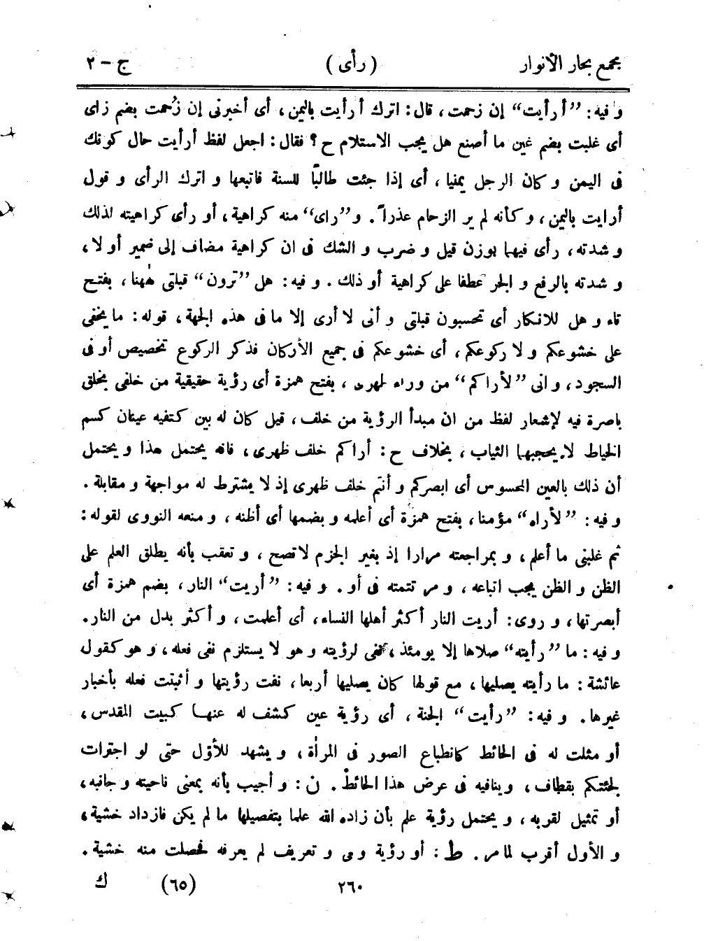 وفيه: "أرأيت" إن زحمت، قال: اترك أرأيت باليمن، أي أخبرني إن زُحمت بضم زاي أي غلبت بضم غين ما أصنع هل يجب الاستلام ح؟ فقال: اجعل لفظ أرأيت حال كونك في اليمن وكان الرجل يمنيا، أي إذا جئت طالبًا للسنة فاتبعها واترك الرأي وقول أرايت باليمن، وكأنه لم ير الزحام عذرًا. و"راي" منه كراهية، أو رأي كراهيته لذلك وشدته، رأى فيهما بوزن قيل وضرب والشك في أن كراهية مضاف إلى ضمير أو لا، وشدته بالرفع والجر عطفًا على كراهية أو ذلك. وفيه: هل "ترون" قبلتي ههنا، بفتح تاء وهل للإنكار أي تحسبون قبلتي وأني لا أرى إلا ما في هذه الجهة، قوله: ما يخفى على خشوعكم ولا روعكم، أي خشوعكم في جميع الأركان فذكر الروع تخصيص أو في السجود، وأنى "لأراكم" من وراء ظهري، بفتح همزة أي رؤية حقيقية من خلفي بخلق باصرة فيه لإشعار لفظ من أن مبدأ الرؤية من خلف، قيل كان له بين كتفيه عينان كسم الخياط لا يحجبهما الثياب، بخلاف ح: أراكم خلف ظهري، فنه يحتمل هذا ويحتمل أن ذلك بالعين المحسوس أي أبصركم وأنتم خلف ظهري إذ لا يشترط له مواجهة ومقابلة. وفيه: "لأراه" مؤمنا، بفتح همزة أي أعلمه وبضمها أي أظنه، ومنعه النووي لقوله: ثم غلبني ما أعلم، وبمراجعته مرارًا إذ بغير الجزم لا تصح، وتعقب بأنه يطلق العلم على الظن والظن يجب اتباعه، ومر تتمته في أو. وفيه: "أريت" النار، بضم همزة أي أبصرتها، وروى: أريت النار أكثر أهلها النساء، أي أعلمت، وأكثر بدل من النار. وفيه: ما "رأيته" صلاها إلا يومئذ، هي لرؤيته وهو لا يستلزم نفي فعله، وهو كقول عائشة: ما رأيته يصليها، مع قولها كان يصليها أربعًا، نفت رؤيتها وأثبتت فعله بأخبار غيرها. وفيه: "رأيت" الجنة، أي رؤية عين كشف له عنها كبيت المقدس، أو مثلت له في الحائط كانطباع الصور في المرأة، ويشهد للأول حتى لو اجترأت لجئتكم بقطاف، وينافيه في عرض هذا الحائط. ن: وأجيب بأنه بمعنى ناحيته وجانبه، أو تمثيل لقربه، ويحتمل رؤية علم بأن زاده الله علما بتفصيلها ما لم يكن فازداد خشية، والأول أقرب لما مر. ط: أو رؤية وفي وتعريف لم يعرفه فحصلت منه خشية.