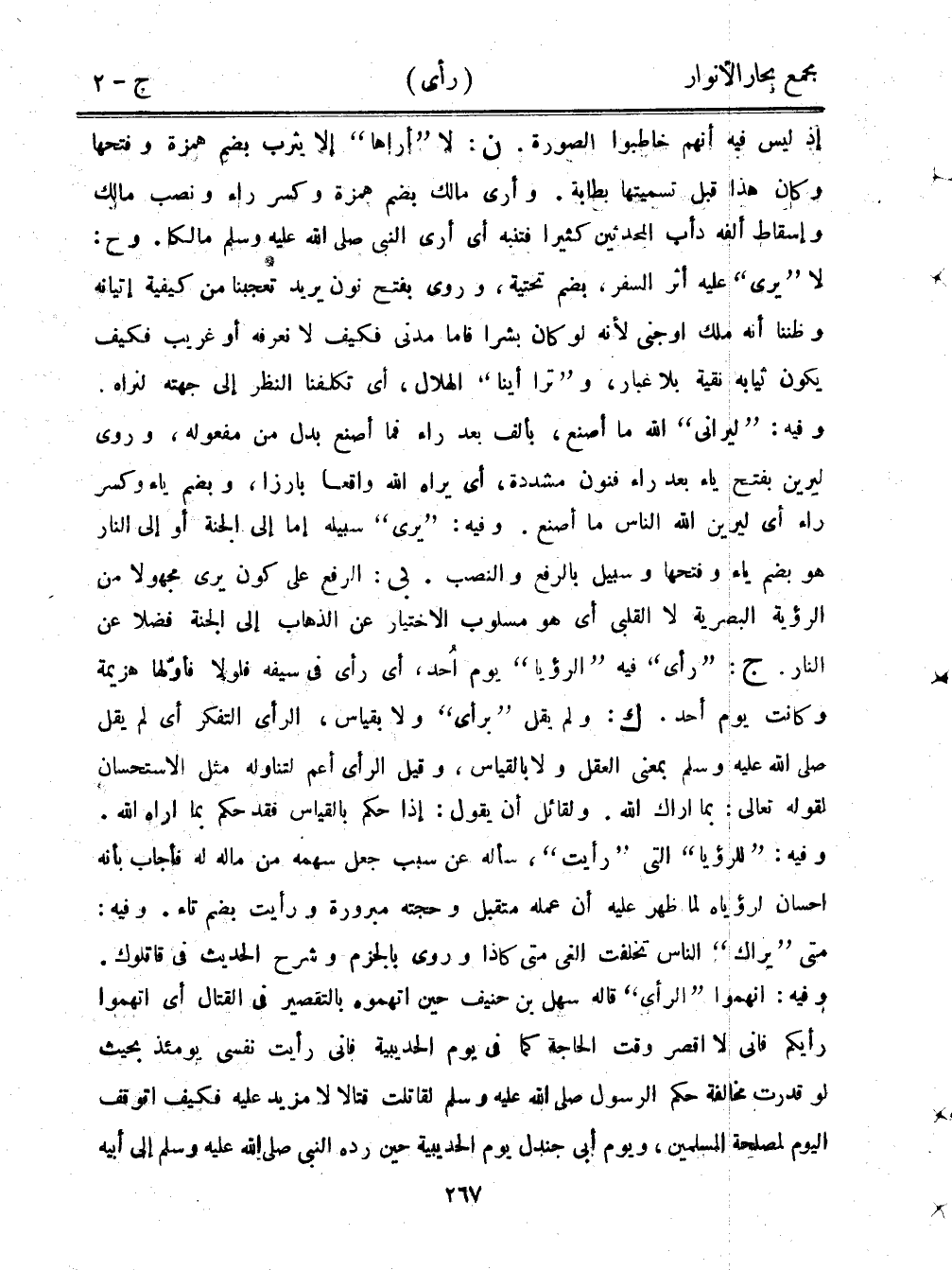 إذ ليس فيه أنهم خاطبوا الصورة. ن: لا "أراها" إلا يثرب بضم همزة وفتحها وكان هذا قبل تسميتها بطابة. وأرى مالك بضم همزة وكسر راء ونصب مالك وإسقاط ألفه دأب المحدثين كثيرًا فتنبه أي أرى النبي صلى الله عليه وسلم مالكًا. وح: لا "يرى" عليه أثر السفر، بضم تحتية، وروى بفتح نون يريد تعجبنا من كيفية إتيانه وننا أنه ملك أوجني لأنه لو كان بشرًا فأما مدني فكيف لا نعرفه أو غريب فكيف يكون ثيابه نقية بلا غبار، و"ترا أينا" الهلال، أي تكلفنا النظر إلى جهته لنراه. وفيه: "ليراني" الله ما أصنع، بألف بعد راء فما أصنع بدل من مفعوله، وروى ليرين بفتح ياء بعد راء فنون مشددة، أي يراه الله واقعًا بارزًا، وبضم ياء وكسر راء أي ليرين الله الناس ما أصنع. وفيه: "يرى" سبيله إما إلى الجنة أو إلى النار هو بضم ياء وفتحها وسبيل بالرفع والنصب. بي: الرفع على كون يرى مجهولًا من الرؤية البصرية لا القلبي أي هو مسلوب الاختيار عن الذهاب إلى الجنة فضلًا عن النار. ج: "رأى" فيه "الرؤيا" يوم أُحد، أي رأى في سيفه فلولا فأولها هزيمة وكانت يوم أحد. ك: ولم يقل "برأي" ولا بقياس، الرأي التفكر أي لم يقل صلى الله عليه وسلم بمعنى العقل ولا بالقياس، وقيل الرأي أعم لتناوله مثل الاستحسان لقوله تعالى: بما أراك الله. ولقائل أن يقول: إذا حكم بالقياس فقد حكم بما أراه الله. وفيه: "للرؤيا" التي "رأيت"، سأله عن سبب جعل سهمه من ماله له فأجاب بأنه إحسان لرؤياه لما ظهر عليه أن عمله متقبل وحجته مبرورة ورأيت بضم تاء. وفيه: متى "يراك" الناس تخلفت الغى متى كإذا وروى بالجزم وشرح الحديث في قاتلوك. وفيه: انهموا "الرأي" قاله سهل بن حنيف حين اتهموه بالتقصير في القتال أي اتهموا رأيكم فني لا أقصر وقت الحاجة كما في يوم الحديبية فإني رأيت نفسي يومئذ بحيث لو قدرت مخالفة حكم الرسول صلى اللهعليه وسلم لقاتلت قتالًا لا مزيد عليه فكيف اتوقف اليوم لمصلحة المسلمين، ويوم أبي جندل يوم الحديبية حين رده النبي صلى الله عليه وسلم إلى أبيه