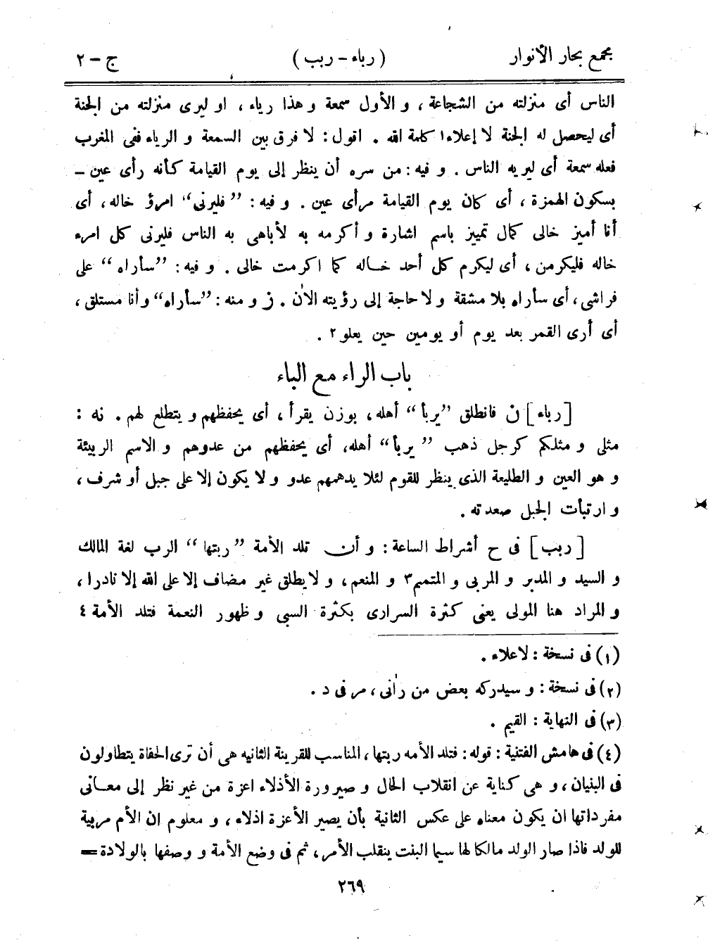 [ربب] في ح أشراط الساعة: وأن تلد الأمة "ربتها" الرب لغة المالك والسيد والمدبر والمربي والمتمم والمنعم، ولا يطلق غير مضاف إلا على الله إلا نادرًا، والمراد هنا المولى يعني كثرة السراري بكثرة السبي وظهور النعمة فتلد الأمة