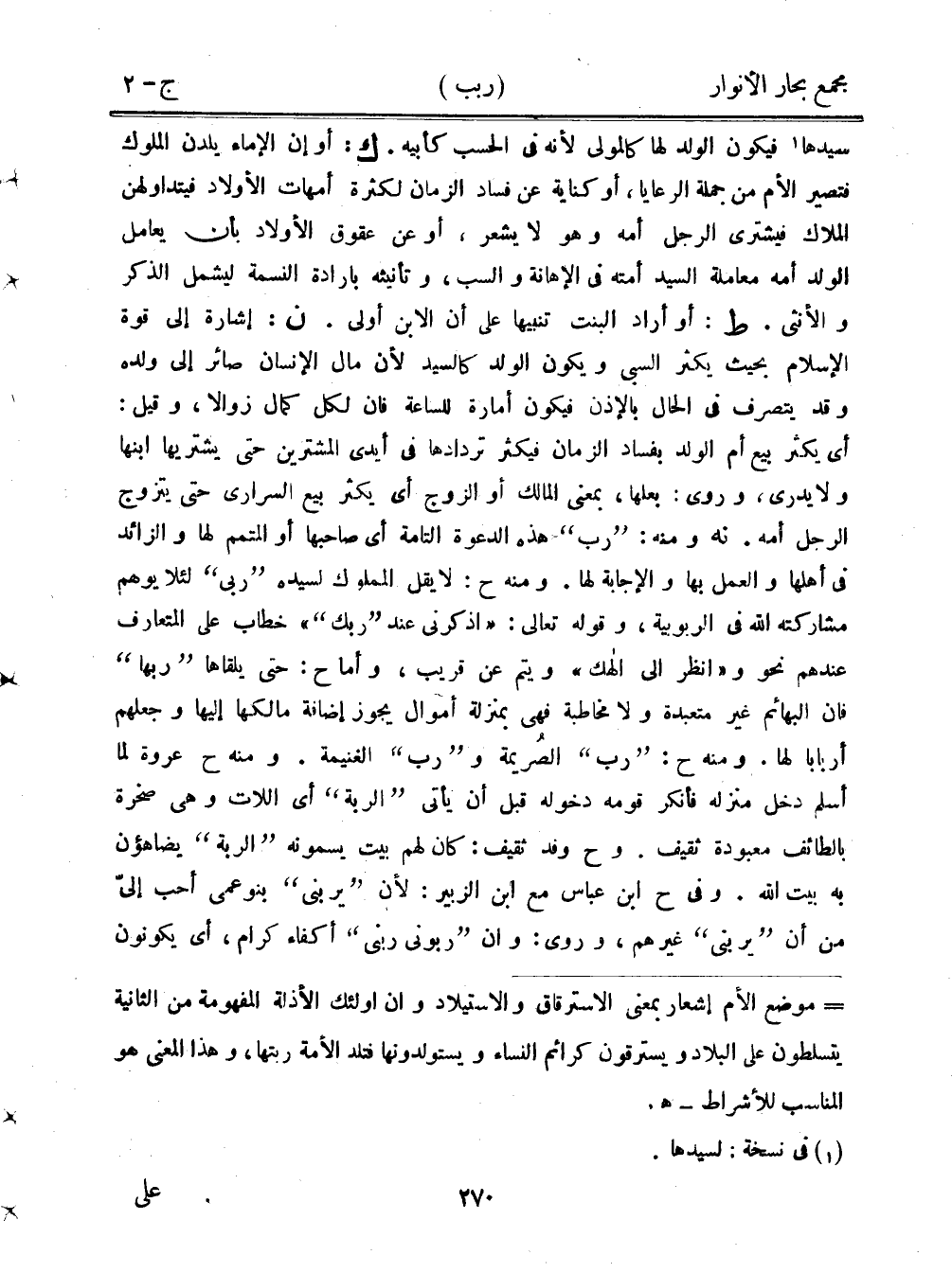 سيدها فيكون الولد لها كالمولى لأنه في الحسب كأبيه. ك: أو إن الإماء يلدن الملوك فتصير الأم من جملة الرعايا، أكناية عن فساد الزمان لكثرة أمهات الأولاد فيتداولهن الملاك فيشتري الرجل أمه وهو لا يشعر، أو عن عقوق الأولاد بأن يعامل الولد أمه معاملة السيد أمته في الإهانة والسب، وتأنيثه بإرادة النسمة ليشمل الذكر والأنثى. ط: أو أراد البنت تنبيهًا على أن الابن أولى. ن: إشارة إلى قوة الإسلام بحيث يكثر السبي ويكون الولد كالسيد لأن مال الإنسان صائر إلى ولده وقد يتصرف في الحال بالإذن فيكون أمارة للساعة فإن لكل كمال زوالًا، وقيل: أي يكثر بيع أم الولد بفساد الزمان فيكثر تردادها في أيدي المشترين حتى يشتريها ابنها ولا يدري، وروى: بعلها، بمعنى المالك أو الزوج أي يكثر بيع السراري حتى يتزوج الرجل أمه. نه ومنه: "رب" هذه الدعوة التامة أي صاحبها أو المتمم لها والزائد في أهلها والعمل بها والإجابة لها. ومنه ح: لا يقل المملوك لسيده "ربي" لئلا يوهم مشاركته الله في الربوبية، وقوله تعالى: "اذكرني عند "ربك"" خطاب على المتعارف عندهم نحو و"انظر إلى إلاهك" ويتم عن قريب، وأما ح: حتى يلقاها "ربها" فإن البهائم غير متعبدة ولا مخاطبة فهي بمنزلة أموال يجوز إضافة مالكها إليها وجعلهم أربابًا لها. ومنه ح: "رب" الصُريمة و"رب" الغنيمة. ومنه ح عروة لما أسلم دخل منزله فأنكر قومه دخوله قبل أن يأتي "الربة" أي اللات وهي صخرة بالطائف معبودة ثقيف. وح وفد ثقيف: كان لهم بيت يسمونه "الربة" يضاهؤن به بيت الله. وفي ح ابن عباس مع ابن الزبير: لأنا "يربني" بنو عمي أحب إليّ من أن "يربني" غيرهم، وروى: وأن "ربوني ربني" أكفاء كرام، أي يكونون