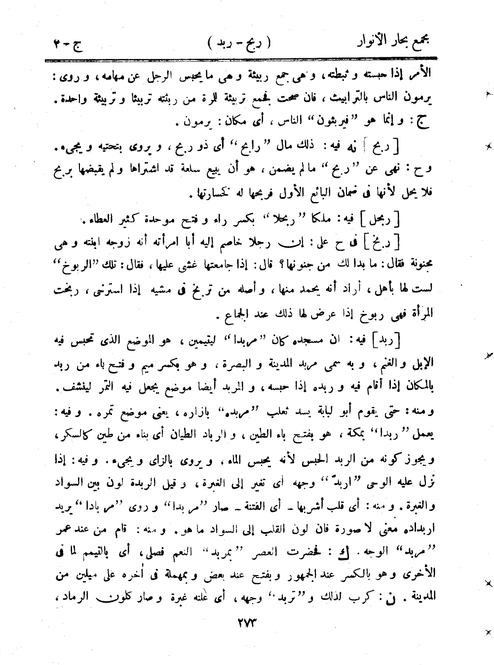 [ربد] فيه: أن مسجده كان "مربدا" ليتيمين، هو الموضع الذي تحبس فيه الإبل والغنم، وبه سمي مربد المدينة والبصرة، وهو بكسر ميم وفتح باء من ربد بالمكان إذا أقام فيه وربده إذا حبسه، والمربد أيضًا موضع يجعل فيه التمر لينشف. ومنه: حتى يقوم أبو لبابة يسد ثعلب "مربده" بازاره، يعني موضع تمره. وفيه: يعمل "ربدا" بمكة، هو بفتح باء الطين، والرباد الطيان أي بناء من طين كالسكر، ويجوز كونه من الربد الحبس لأنه يحبس الماء، ويروى بالزاي ويجيء. وفيه: إذا نزل عليه الوحي "اربد" وجهه أي تغير إلى الغبرة، وقيل الربدة لون بين السواد والغبرة. ومنه: أي قلب أشربها- أي الفتنة - صار "مربدا" وروى "مربادا" يريد اربداده معنى لا صورة فإن لون القلب إلى السواد ما هو. ومنه: قام من عند عمر "مربد" الوجه. ك: فحضرت العصر "بمربد" النعم فصلى، أي بالتيمم لما في الأخرى وهو بالكسر عند الجمهور وبفتح عند بعض وبمهملة في أخره على ميلين من المدينة. ن: كرب لذلك و"تربد" وجهه، أي علته غبرة وصار كلون الرماد،