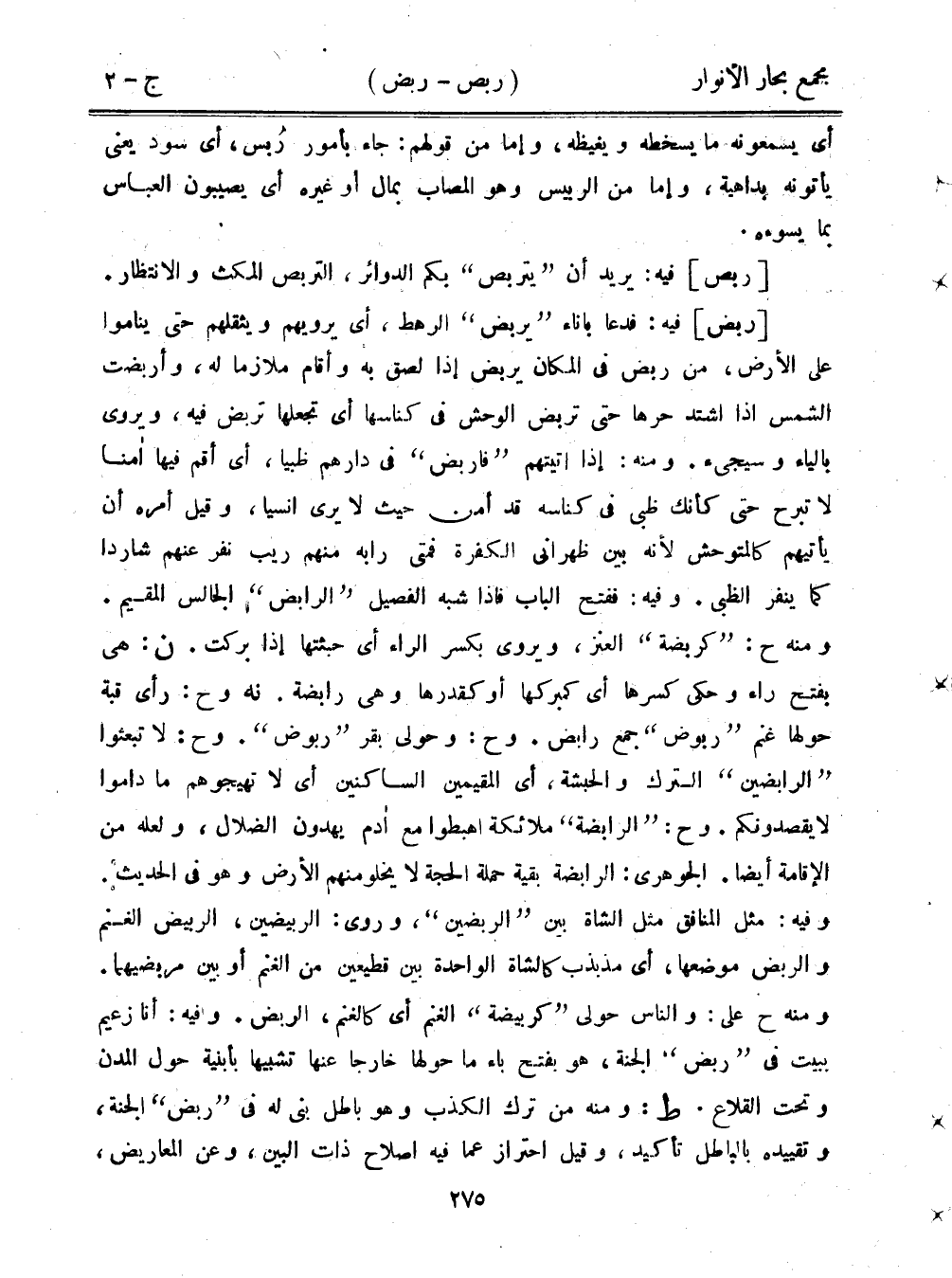 [ربض] فيه: فدعا بإناء "يربض" الرهط، أي يرويهم ويثقلهم حتى يناموا على الأرض، من ربض في المكان يربض إذا لصق به وأقام ملازمًا له، وأربضت الشم سإذا اشتد حرها حتى تربض الوحش في كناسها أي تجعلها تربض فيه، ويروي بالياء وسيجيء. ومنه: إذا اتيتهم "فاربض" في دارهم ظبيًا، أي أقم فيها أمنا لا تبرح حتى كأنك بي في كناسه قد أمن حيث لا يرى انسيا، وقيل أمره أن يأتيهم كالمتوحش لأنه بين ظهراني الكفرة فمتى رابه منهم ريب نفر عنهم شاردًا كما ينفر الظبي. وفيه: ففتح الباب فإذا شبه الفصيل "الرابض" الجالس المقيم. ومنه ح: "كربضة" العنز، ويروى بكسر الراء أي حبثتها إذا بركت. ن: هي بفتح راء وحكى كسرها أي كمبركها أو كقدرها وهي رابضة. نه وخ: رأى قبة حولها غنم "ربوض" جمع رابض. وح: وحولي بقر "ربوض". وح: لا تبعثوا "الرابضين" الترك والحبشة، أي المقيمين الساكنين أي لا تهيجوهم ما داموا لا يقصدونكم. وح: "الرابضة" ملائكة اهبطوا مع أدم يهدون الضلال، ولعله من الإقامة أيضًا. الجوهري: الرابضة بقية حملة الحجة لا يخلو منهم الأرض وهو في الحديث. وفيه: مثل المنافق مثل الشاة بين "الربضين"، وروى: الربيضين، الربيض الغسنم والربض موضعها، أي مذبذب كالشاة الواحدة بين قطيعين من الغنم أو بين مربضيهما. ومنه ح على: والناس حولي "كربيضة" الغنم أي كالغنم، الربض. وفيه: أنا زعيم ببيت في "ربض" الجنة، هو بفتح باء ما حولها خارجًا عنها تشبيهًا بأبنية حول المدن وتحت القلاع. ط: ومنه من ترك الكذب وهو باطل بنى له في "ربض" الجنة، وتقييده بالباطل تأكيد، وقيل احتراز عما فيه إصلاح ذات البين، وعن المعاريض،