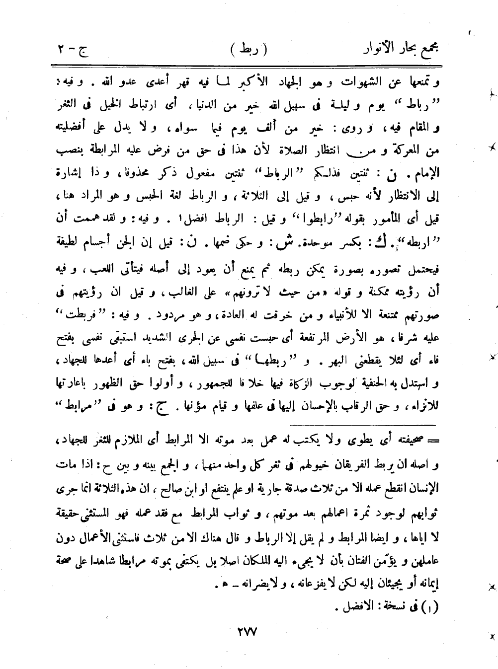وتمنعها عن الشهوات وهوا لجهاد الأكبر لما فيه قهر أعدى عدو الله. وفيه: "رباط" يوم وليلة في سبيل الله خير من الدنيا، أي ارتباط الخيل في الثغر والمقام فيه، وروى: خير من ألف يوم فيما سواه، ولا يدل على أفضليته من المعركة ومن انتظار الصلاة لأن هذا في حق من فرض عليه المرابطة بنصب الإمام. ن: ثنتين فذلكم "الرباط" ثنتين مفعول ذكر محذوفًا، وذا إشارة إلى الانتظار لأنه حبس، وقيل إلى الثلاثة، والرباط لغة الحبس وهو المراد هنا، قيل أي المأمور بقوله "رابطوا" وقيل: الرباط أفضل. وفيه: ولقد هممت أن "اربطه". ك: بكسر موحدة. ش: وحكى ضمها. ن: قيل إن الجن أجسام لطيفة فيحتمل تصوره بصورة يمكن ربطه ثم يمنع أن يعود إلى أصله فيتأتى اللعب، وفيه أن رؤيته ممكنة وقوله "من حيث لا ترونهم" على الغالب، وقيل أن رؤيتهم في صورتهم ممتنعة إلا للأنبياء ومن خرقت له العادة، وهو مردود. وفيه: "فربطت" عليه شرفًا، هو الأرض المرتفعة أي حبست نفسي عن الجري الشديد استبقى نفسي بفتح فاء أي لئلا يقطعني البهر. و"ربطها" في سبيل الله، بفتح باء أي أعدها للجهاد، واستهدل به الحنفية لوجوب الزكاة فيها خلافًا للجمهور، وأولوا حق الظهور بإعارتها للإنزاء، وحق الرقاب بالإحسان إليها في علفها وقيام مؤنها. ج وهو في "مرابط"