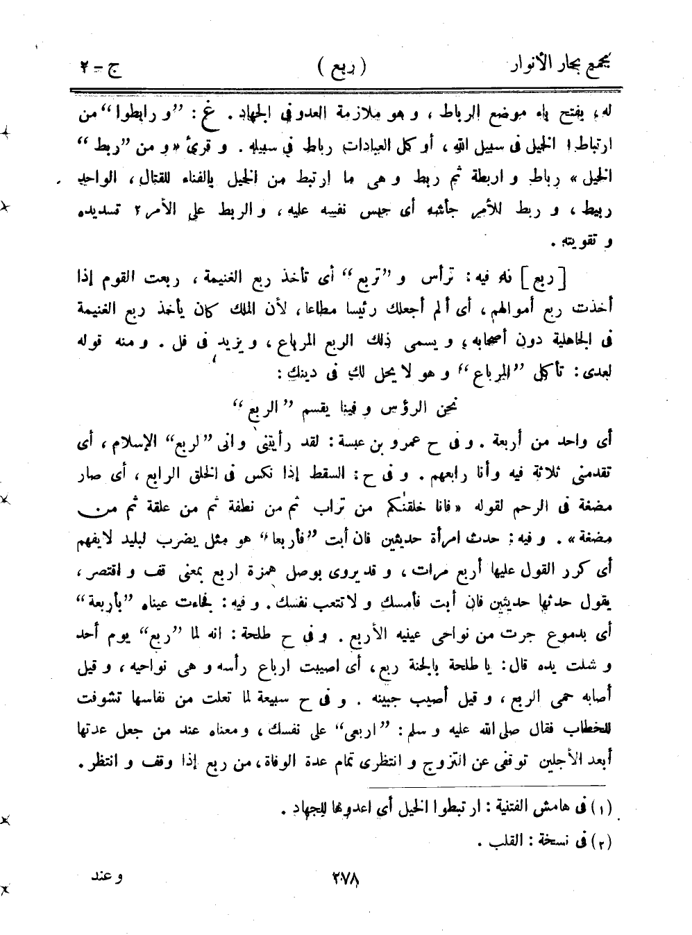 أي واحد من أربعة. وفي ح عمرو بن عبسة: لقد رأيتني وإني "لربع" الإسلام، أي تقدمني ثلاثة فيه وأنا رابعهم. وفي ح: السقط إذا نكس في الخلق الرابع، أي صار مضغة في الرحم لقوله "فإنا خلقناكم من تراب ثم من نطفة ثم من علقة ثم من مضغة". وفيه: حدث امرأة حديثين فإن أبت "فأربعا" هو مثل يضرب لبليد لا يفهم أي كرر القول عليها أربع مرات، وقد يروى بوصل همزة أربع بمعنى قف واقتصر، يقول حدثها حديثين فإن أبت فأمسك ولا تتعب نفسك. وفيه: فجاءت عيناه "بأربعة" أي بدموع جرت من نواحي عينيه الأربع. وفي ح طلحة: أنه لما "ربع" يوم أحد وشلت يده قال: يا طلحة بالجنة ربع، أي أصيبت أرباع رأسه وهي نواحيه، وقيل أصابه حمى الربع، وقيل أصيب جبينه. وفي ح سبيعة لما تعلت من نفاسها تشوفت للخطاب فقال صلى الله عليه وسلم: "اربعي" على نفسك، ومعناه عند من جعل عدتها أبعد الأجلين توقفي عن التزوج وانتظري تمام عدة الوفاة، من ربع إذا وقف وانتظر.