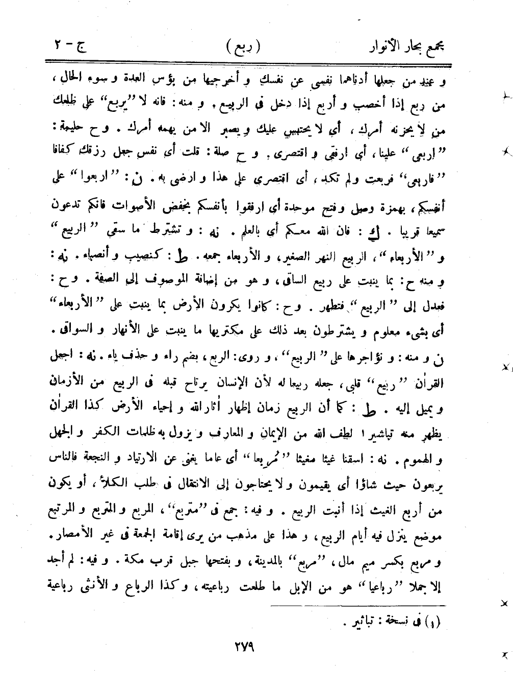 وعند من جعلها أدناهما نفسي عن نفسك وأخرجيها من بؤس العدة وسوء الحال، من ربع إذا أخصب وأربع إذا دخل في الربيع. ومنه: فإنه لا "يربع" على ظلعك من لا يحزنه أمرك، أي لا يحتبس عليك ويصبر إلا من يهمه أمرك. وح حليمة: "اربعي" علينا، أي ارفعي واقتصري. وح صلة: قلت أي نفس جعل رزقك كفافا "فاربعي" فربعت ولم تكد، أي اقتصري على هذا وارضي به. ن: "اربعوا" على أنفسكم، بهمزة وصل وفتح موحدة أي ارفقوا بأنفسكم بخفض الأصوات فإنكم تدعون سميعًا قريبًا. ك: فإن الله معكم أي بالعلم. نه: وتشترط ما سقي "الربيع" و"الأربعاء"، الربيع النهر الصغير، والأربعاء جمعه. ط: كنصيب وأنصباء. نه: ومنه ح: بما ينبت على ربيع الساقي، وهو من إضافة الموصوف إلى الصفة. وح: فعدل إلى "الربيع" فتطهر. وح كانوا يكرون الأرض بما ينبت على "الأربعاء" أي بشيء معلوم ويشترطون بعد ذل على مكتريها ما ينبت على الأنهار والسواقي. ن ومنه: ونؤاجرها على "الربيع"، وروى: الربع، بضم راء وحذف ياء. نه: اجعل القرآن "ربيع" قلبي، جعله ربيعًا له لأن الإنسان يرتاح قبله في الربيع من الأزمان ويميل إليه. ط: كما أن الربيع زمان إظهار آثار الله وإحياء الأرض كذا القرآن يظهر منه تباشير لطف الله من الإيمان والمعارف ويزول به ظلمات الكفر والجهل والهموم. نه: اسقنا غيثًا مغيثًا "مُربعا" أي عاما يغني عن الارتياد والنجعة فالناس يربعون حيث شاؤوا أي يقيمون ولا يحتاجون إلى الانتقال في طلب الكلأ، أو يكون من أربع الغيث إذا انبت الربيع. وفيه: جمع في "متربع"، المربع والمتربع والمرتبع موضع ينزل فيه أيام الربيع، وهذا على مذهب من يرى إقامة الجمعة في غير الأمصار. ومربع بكسر ميم مال، "مربع" بالمدينة، وبفتحها جبل قرب مكة. وفيه: لم أجد إلا جملًا "رباعيًا" هو من الإبل ما طلعت رباعيته، وكذا الرباع والأنثى رباعية