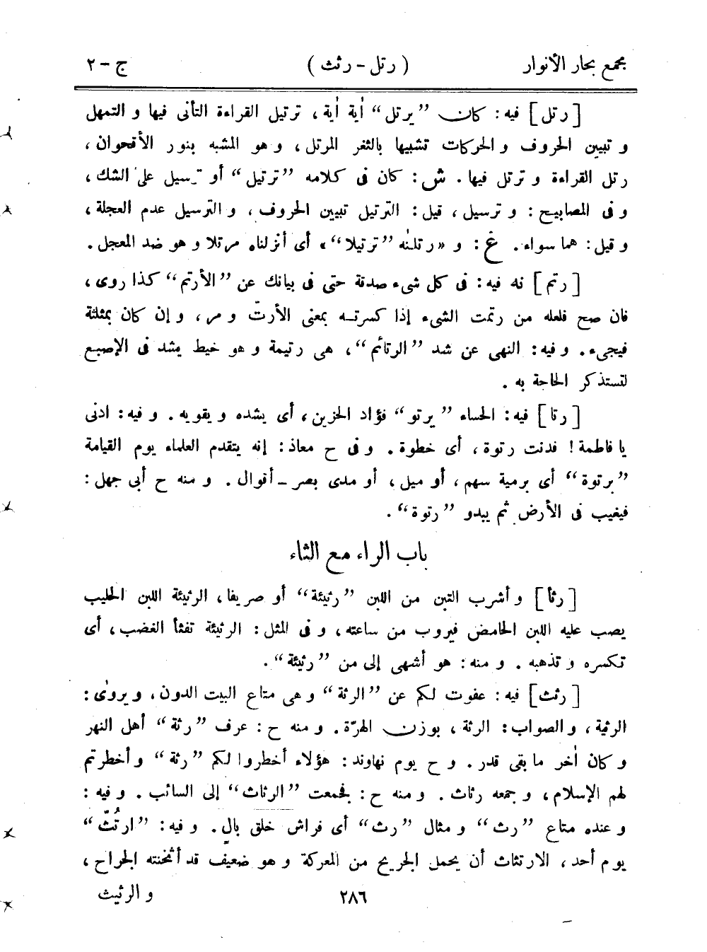 [رتل] فيه: كان "يرتل" أية أية، ترتيل القراءة التأني فيها والتمهل وتبيين الحروف والحرات تشبيهًا بالثغر المرتل، وهو المشبه بنور الأقحوان، رتل القراءة وترتل فيها. ش: كان في كلامه "ترتيل" أو ترسيل على الشك، وفي المصابيح: وترسيل، قيل: الترتيل تبيين الحروف، والترسيل عدم العجلة، وقيل: هما سواء. غ: "ورتلناه "ترتيلا"" أي أنزلناه مرتلًا وهو ضد المعجل.