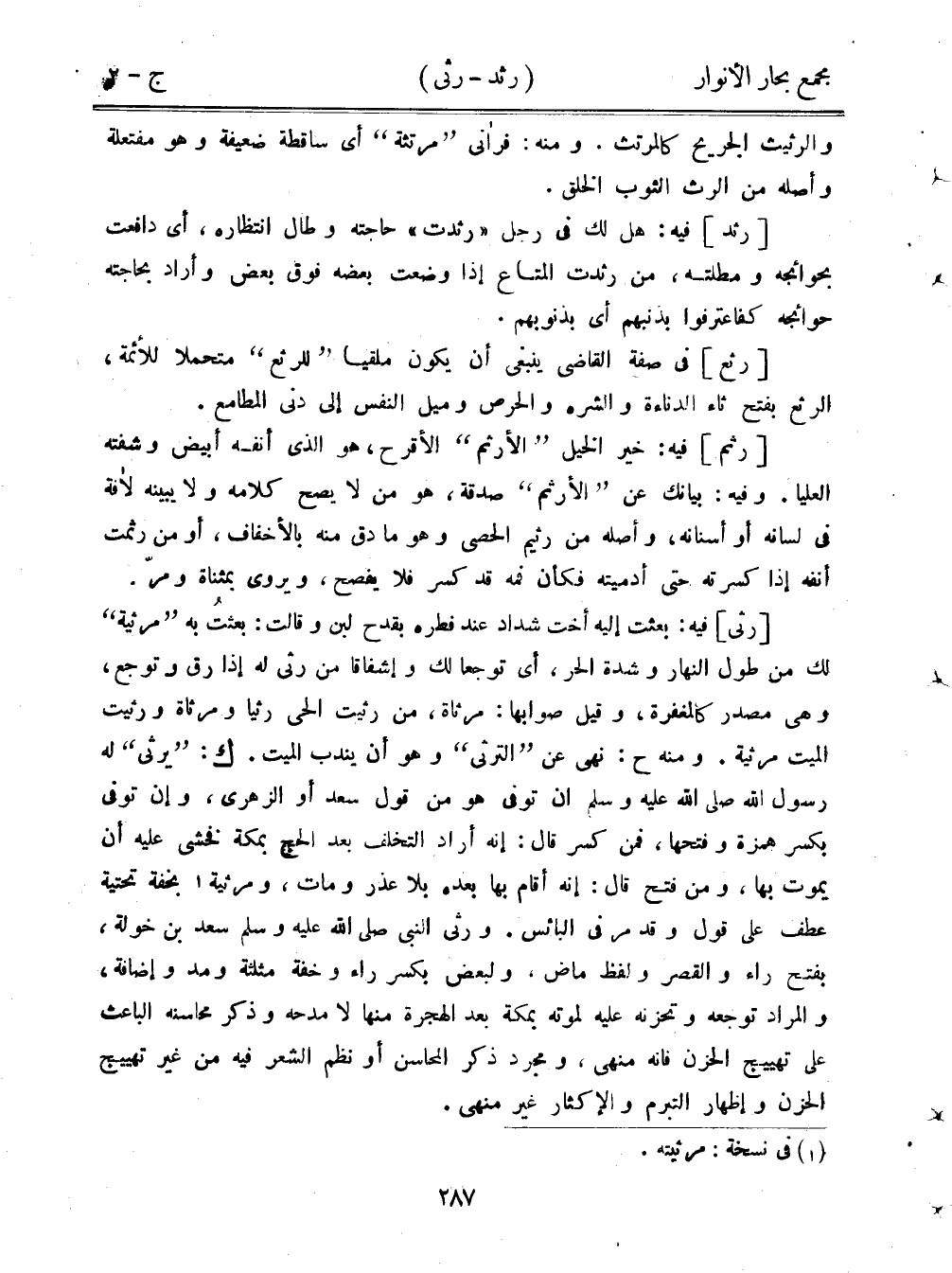 [رثى] فيه: بعثت إليه أخت شداد عند فطره بقدح لبن وقالت: بعثت به "مرثية" لك من طول النهار وشدة الحر، أي توجعا لك وإشفاقًا من رثى له إذا رق وتوجع، وهي مصدر كالمغفرة، وقيل صوابها: مرثاة، من رثيت الحي رثيا ومرثاة ورثيت الميت مرثية. ومنه ح: نهى عن "الترثي" وهو أن يندب الميت. ك: "يرثى" له رسول الله صلى الله عليه وسلم أن توفى هو من قول سعد أو الزهري، وإن توفى بكسر همزة وفتحها، فمن كسر قال: أنه أراد التخلف بعد الحج بمكة فخشي عليه أن يموت بها، ومن فتح قال: نه أقام بها بعده بلا عذر ومات، ومرثية بخفة تحتية عطف على قول وقد مر في البائس. ورثى النبي صلى الله عليه وسلم سعد بن خولة، بفتح راء والقصر ولفظ ماض، ولبعض بكسر راء وخفة مثلثة ومد وإضافة، والمراد توجعه وتحزنه عليه لموته بمكة بعد الهجرة منها لا مدحه وذكر محاسنه الباعث على تهييج الحزن فإنه منهى، ومجرد ذكر المحاسن أو نظم الشعر فيه من غير تهييج الحزن وإهار التبرم والإكثار غير منهي.