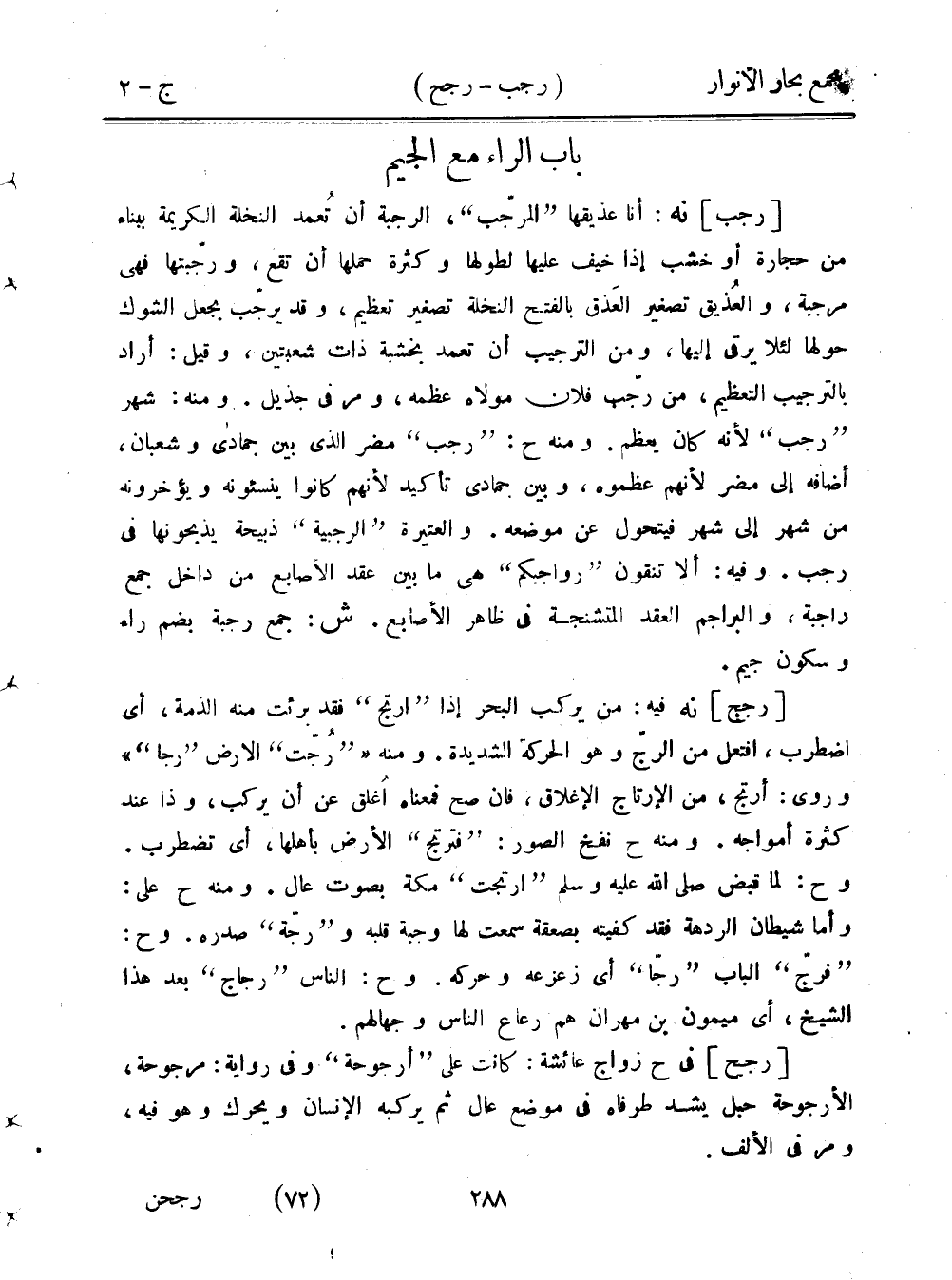 [رجج] نه فيه: من يركب البحر إذا "ارتج" فقد برئت منه الذمة، أي اضطرب، افتعل من الرج وهو الحركة الشديدة. ومنه "رُجت" الأرض "رجا"" وروى: أرتج، من الإرتاج الإغلاق، فإن صح فمعناه أغلق عن أن يركب، وذا عند كثرة أمواجه. ومنه ح نفخ الصور "فترتج" الأرض بأهلها، أي تضطرب. وح: لما قبض صلى الله عليه وسلم "ارتجت" مكة بصوت عال. ومنه ح على: وأما شيطان الردهة فقد كفيته بصعقة سمعت لها وجبة قلبه و"رجة" صدره. وح: "فرج" الباب "رجا" أي زعزعه وحركه. وح: الناس "رجاج" بعد هذا الشيخ، أي ميمون بن مهران هم رعاع الناس وجهالهم.
