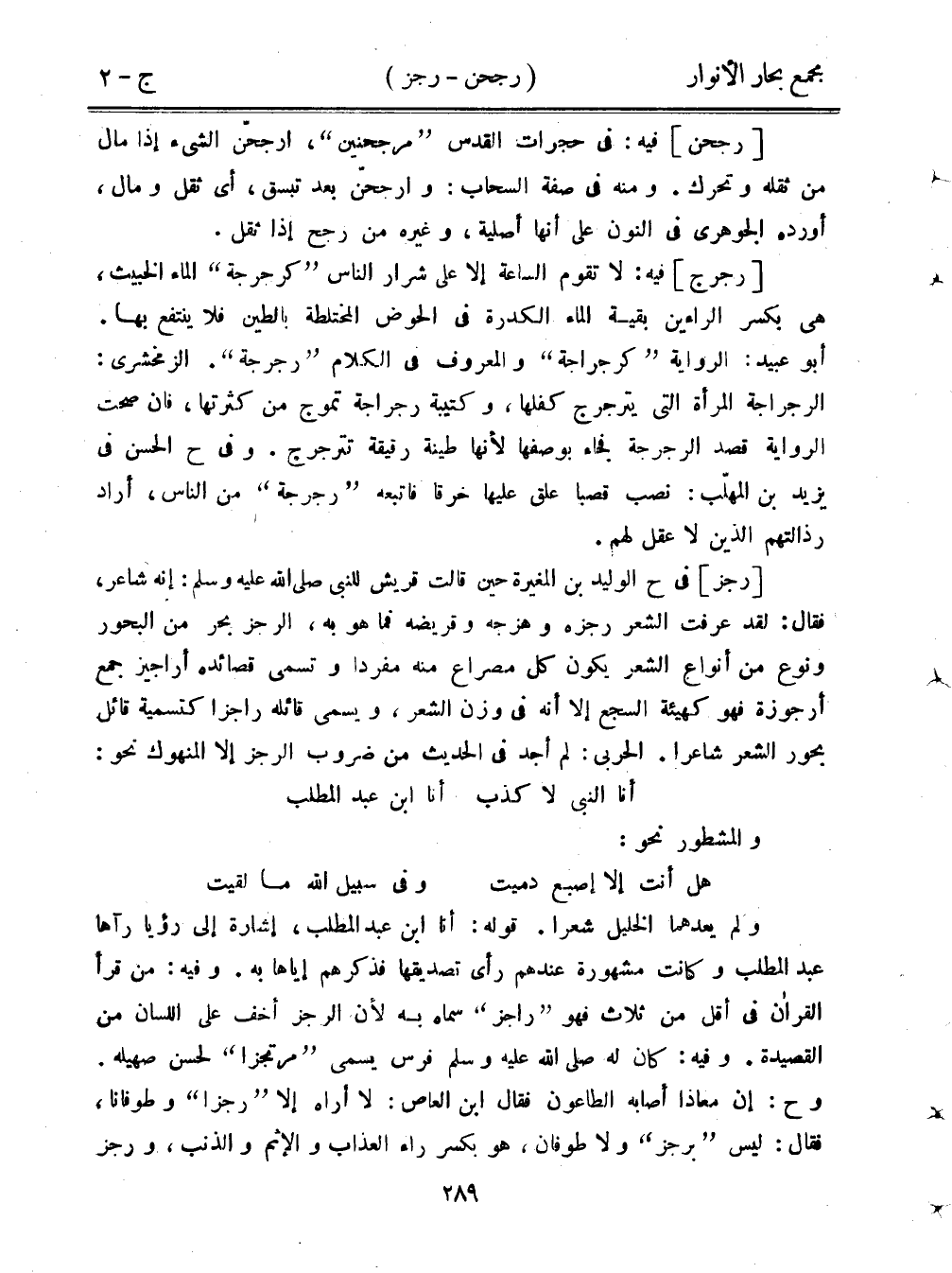 [رجز] في ح الوليد بن المغيرة حين قالت قريش للنبي صلى الله عليه وسلم: إنه شاعر، فقال: لقد عرفت الشعر رجزه وهزجه وقريضه فما هو به، الرجز بحر من البحور ونوع من أنواع الشعر يكون كل مصراع منه مفردًا وتسمى قصائده أراجيز جمع أرجوزة فهو كهيئة السجع إلا أنه في وزن الشعر، ويسمى قائله راجزًا تسمية قائل بحور الشعر شاعرًا. الحربي: لم أجد في الحديث من ضروب الرجز إلا المنهوك نحو: