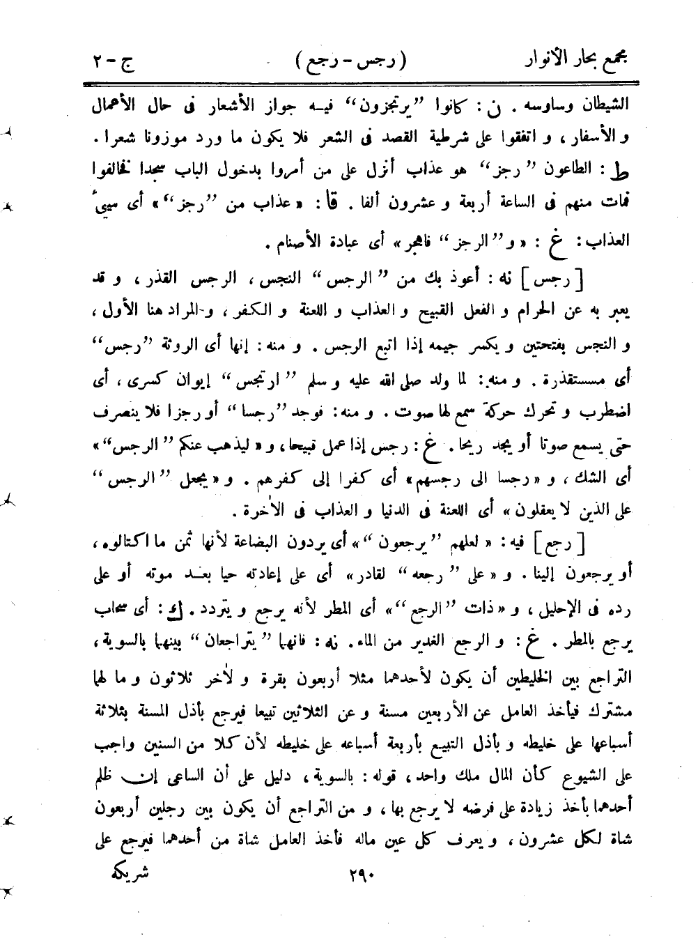 [رجع] فيه: "لعلهم "يرجعون"" أي يردون البضاعة لأنها ثمن ما اكتالوه، أو يرجعون إلينا. و"على "رجعه" لقادر" أي على إعادته حيًا بعد موته أو على رده في الإحليل، و"ذات "الرجع"" أي المطر لأنه يرجع ويتردد. ك: أي سحاب يرجع بالمطر. غ: والرجع الغدير من الماء. نه: فإنهما "يتراجعان: بينهما بالسوية، التراجع بين الخليطين أن يكون لأحدهما مثلًا أربعون بقرة ولأخر ثلاثون وما لهما مشترك فيأخذ العامل عن الأربعين مسنة وعن الثلاثين تبيعًا فيرجع بأذل المسنة بثلاثة أسباعها على خليطه وبأذل التبيع بأربعة أسباعه على خليطه لأن كلا من السنين واجب على الشيوع أن المال ملك واحد، قوله: بالسوية، دليل على أن الساعي إن لم أحدهما بأخذ زيادة على فرضه لا يرجع بها، ومن التراجع أنا يكون بين رجلين أربعون شاة لكل عشرون، ويعرف كل عين ماله فأخذ العامل شاة من أحدهما فيرجع على