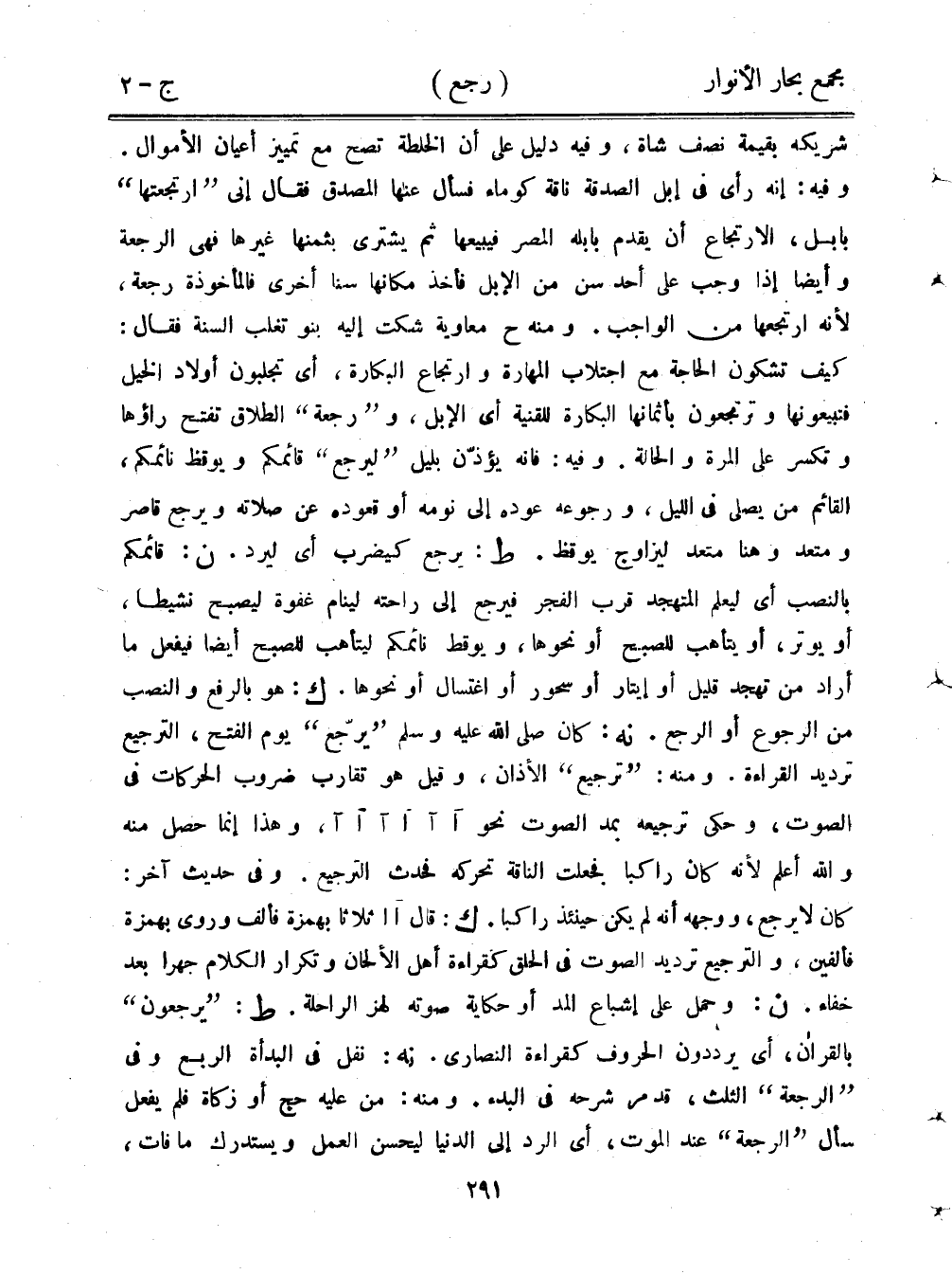 شريكه بقيمة نصف شاة، وفيه دليل على أن الخلطة تصح مع تمييز أعيان الأموال. وفيه: نه رأى في إبل الصدقة ناقة كوماء فسأل عنها المصدق فقال إني "ارتجعتها" بإبل، الارتجاع أن يقدم بإبله المصر فيبيعها ثم يشتري بثمنها غيرها فهي الرجعة وأيضًا إذا وجب على أحد سن من الإبل فأخذ مكانها سنًا أخرى فالمأخوذة رجعة، لأنه ارتجعها من الواجب. ومنه ح معاوية شكت إليه بنو تغلب السنة فقال: كيف تشكون الحاجة مع اجتلاب المهارة وارتجاع البكارة، أي تجلبون أولاد الخيل فتبيعونها وترتجعون بأثمانها البكارة للقنية أي الإبل، و"رجعة" الطلاق تفتح راؤها وتكسر على المرة والحالة. وفيه: فإنه يؤذن بليل "ليرجع" قائمكم ويوقظ نائمكم، القائم من يصلي في الليل، ورجوعه عوده إلى نومه أو قعوده عن صلاته ويرجع قاصر ومتعد وهنا متعد ليزاوج يوقظ. ط: يرجع كيضرب أي ليرد. ن: قائمكم بالنصب أي ليعلم المتهجد قرب الفجر فيرجع إلى راحته لينام غفوة ليصبح نشيطًا، أو يوتر، أو يتأهب للصبح أو نحوها، ويوقط نائمكم ليتأهب للصبح أيضًا فيفعل ما أراد من تهجد قليل أو إيتار أو سحور أو اغتسال أو نحوها. ك: هو بالرفع والنصب من الرجوع أو الرجع. نه: كان صلى الله عليه وسلم "يرجع" يوم الفتح، الترجيع ترديد القراءة. ومنه: "ترجيع" الأذان، وقيل هو تقارب ضروب الحركات في الصوت، وحكى ترجيعه بمد الصوت نحو آآ آآ آآ آآ آ، وهذا إنما حصل منه والله أعلم لأنه كان راكبًا فجعلت الناقة تحركه فحدث الترجيع. وفي حديث آخر: كان لا يرجع، ووجهه أنه لم يكن حينئذ راكبًا. ك: قال آآ ثلاثًا بهمزة فألف وروى بهمزة فألفين، والترجيع ترديد الصوت في الحلق كقراءة أهل الألحان وتكرار الكلام جهرًا بعد خفاء. ن: وحمل على إشباع المد أو حكاية صوته لهز الراحلة. ط: "يرجعون" بالقرآن، أي يرددون الحروف كقراءة النصارى. نه: نفل في البداءة الربع وفي "الرجعة" الثلث، قد مر شرحه في البدء. ومنه: من عليه حج أو زكاة فلم يفعل سأل "الرجعة" عند الموت، أي الرد إلى الدنيا ليحسن العمل ويستدرك ما فات،