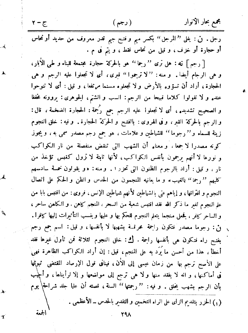 [رجم] نه: هل ترى "رجما" هو بالحركة حجارة مجتمعة للبناء وطي الأبار، وهي الرجام أيضًا. ومنه: "لا ترجموا" قبري، أي لا تجعلوا عليه الرجم وهي الحجارة، أراد أن تسؤوه بالأرض ولا تجعلوه مسنما مرتفعًا، وقيل: أي لا تنوحوا عنده ولا تقولوا كلامًا قبيحًا من الرجم: السب والشتم، الجوهري: يروونه مخففًا والصحيح تشديده، أي لا تجعلوا عليه الرجم جمع رُجمة: الحجارة الضخمة، قال والرجم بالحركة القبر، وفي الهروي: بالفتح والحركة الحجارة. وفيه: خلق النجوم زينة للسماء و"رجوما" للشياطين وعلامات، هو جمع رجم مصدر سمي به، ويجوز كونه مصدرًا لاجمعًا، ومعناه أن الشهب التي تنقض منفصلة من نار الكواكب ونورها لا أنهم يرجمون بأنفس الكواكب، لأنها ثابتة لا تزول كقبس تؤخذ من نار، وقيل: أراد بالرجوم النون التي تحزر. ومنه: "ويقولون خمسة سادسهم كلبهم "رجمًا" بالغيب" وما يعانيه المنجمون من الحدس والظن والحكم على اتصال النجوم وافتراقها، وإياهم عني بالشياطين لنهم شياطين الإنس، فروى: من اقتبس بابًا من علم النجوم لغير ما ذكر الله فقد اقتبس شعبة من السحر، المنجم كاهن، والكاهن ساحر، والساحر كافر، فجعل منجمًا يتعلم النجوم للحكم بها وعليها وينسب التأثيرات إليها كافرًا. ن: رجومًا مصدر فتكون راجمة محرقة بشهبها لا بأنفسها، وقيل: اسم جمع رجم بفتح راء فتكون هي بأنفسه راجمة. ك: خلق النجوم لثلاثة فمن تأول غيرها فقد أخطأ، هذا من أحسن ما يرد به على المنجم، قيل: إن أراد الكواكب الظاهرة فهي على الأصح ترجم بها من زمان عيسى إلى الآن، فينافي قول الإرصاد المقتضى ثبوتها في أماكنها، وأنه لا يفقد منها ولا هي ترجع إلى مواضعها وإلا لرأيناها، وأجيب بأن الرجم بشهب يخلق. وفيه: "رجمتها" السنة، قصته أن عليًا جلد شراحة يوم