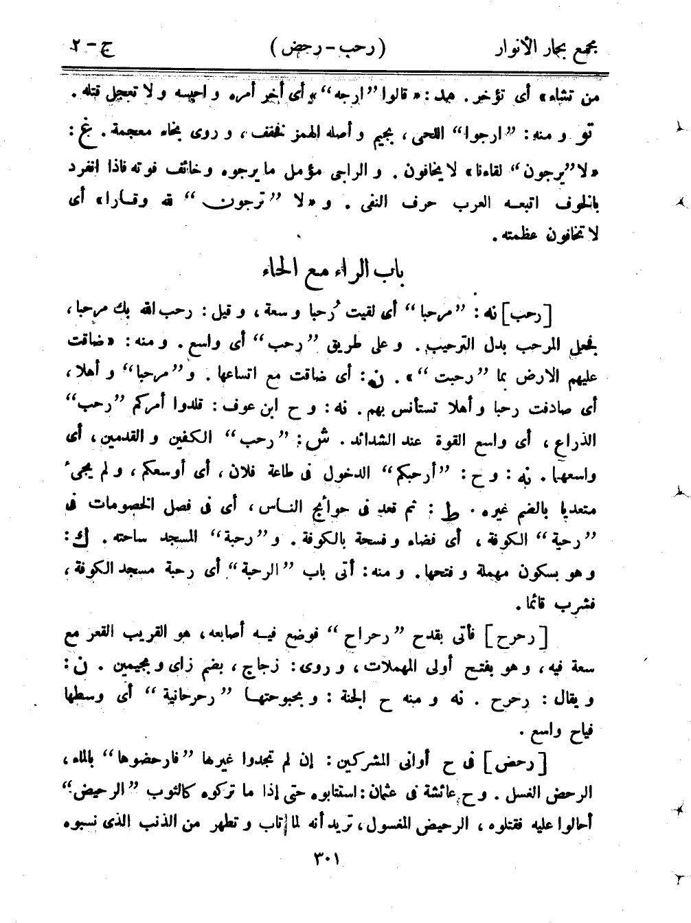 [رحب] نه: "مرحبا" أي لقيت رُحبًا وسعة، وقيل: رحب الله بك مرحبًا، فجعل المرحب بدل الترحيب. وعلى طريق "رحب" أي واسع. ومنه: "ضاقت عليهم الأرض بما "رحبت"". ن: أي ضاقت مع اتساعها. و"مرحبًا" وأهلا، أي صادفت رحبًا وأهلا تستأنس بهم. نه: وح ابن عوف: قلدوا أمركم "رحب" الذراع، أي واسع القوة عند الشدائد. ش: "رحب" الكفين والقدمين، أي واسعهما. نه: وح: "أرحبكم" الدخول في طاعة فلان، أي أوسعكم، ولم يجيء متعديًا بالضم غيره. ط: ثم قعد في حوائج الناس، أي في فصل الخصومات في "رحية" الكوفة، أي فضاء وفسحة بالكوفة. و"رحبة" المسجد ساحته. ك: وهو بسكون مهملة وفتحها. ومنه: أتى باب "الرحبة" أي رحبة مسجد الكوفة، فشرب قائمًا.