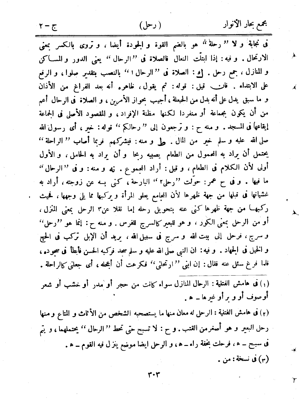 في نجابة ولا "رحلة" هو بالضم القوة والجودة أيضًا، وتروى بالكسر بمعنى الارتحال. وفيه: إذا ابتلت النعال فالصلاة في "الرحال" يعني الدور والمساكن والمنازل، جمع رحل. ك: الصلاة في "الرحال" بالنصب بتقدير صلوا، والرفع على الابتداء. فإن قيل: قوله: ثم يقول، ظاهره أنه بعد الفراغ من الأذان وما سبق يدل على أنه بدل من الحبعلة، أجيب بحواز الأمرين، والصلاة في الرحال أعم من أن يكون بجماعة أو منفردًا لكنها مظنة الإفراد، والمقصود الأصلي في الجماعة إيقاعها في المسجد. ومنه ح: وترجعون إلى "رحالكم" قوله: خير، أي رسول الله صلى الله عليه وسلم خير من المال. ط ومنه: فيشركهم فربما أصاب "الراحلة" يحتمل أني راد به المحمول من الطعام يصيبه ربحًا وأن يراد به الحامل، والأول أولى لأن الكلام في الطعام، وقيل: أراد المجموع. نه ومنه: وفي "الرحال" ما فيها. وفي ح عمر: حولت "رحلي" البارحة، كنى به عن زوجته، أراد به غشيانها في قبلها من جهة ظهرها لأن المجامع يعلو المرأة ويركبها مما يلي وجهها، فحيث ركبها من جهة هرها كنى عنه بتحويل رحله إما نقلًا عن الرحل بمعنى المنزل، أو من الرحل بمعنى الكور، وهو للبعير السرج للفرس. ومنه ح: إنما هو "رحل" وسرج، فرحل إلى بيت الله وسرج في سبيل الله، يريد أن الإبل تركب في الحج والخيل في الجهاد. وفيه: أن النبي صلى الله عليه وسلم سجد فركبه الحسن فأبطأ في سجوده، فلما فرغ سئل عنه فقال: إن ابني "ارتحلني" فكرهت أن أعجله، أي جعلني كالراحلة.