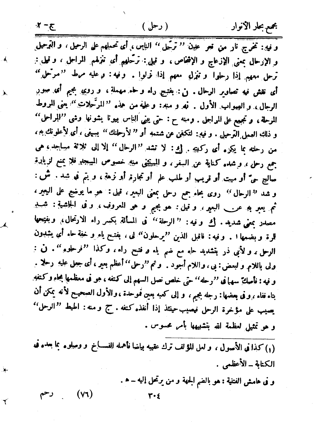وفيه: تخرج نار من قعر عدن "ترحل" الناس، أي تحملهم على الرحيل، والرحيل والإرحال بمعنى الإزعاج والإشخاص، وقيل: ترحلهم أي تنزلهم المراجل، وقيل ترحل معهم إذا رحلوا وتنزل معهم إذا نزلوا. وفيه: وعليه مرط "مرحل" أي نقش فيه تصاوير الرحال. ن: بفتح راء وحاء مهملة، وروى بجيم أي صور الرجال، والصواب الأول. نه ومنه: وعليه من هذه "المرحلات" يعني المروط المرحلة، وتجمع على المراجل. ومنه ح: حتى يبنى الناس بيوتًا يشونها وشي "المراحل" وذلك العمل الترحيل. وفيه: لتكفن عن شتمه أو "لأرحلنك" بسيفي، أي لأعلونك به، من رحلته بما يكره أي ركبته. ك: لا تشد "الرحال" إلا على ثلاثة مساجد، هي جمع رحل، وشده كناية عن السفر، والمستثنى منه خصوص المسجد فلا يمنع لزيارة صالح حي أو ميت أو قريب أو طلب علم أو تجارة أو نزهة، ويتم في شد. ش: وشد "الرحال" روى بحاء جمع رحل بمعنى البعير، قيل: هو ما يوضع على البعير، ثم يعبر به عن البعير، وقيل: هو بجيم وهو المعروف، فوي الحاشية: شد مصدر بمعنى شديد. ك وفيه: "الرحلة" في المسالة بكسر راء الارتحال، وبفتحها للمرة وبضمها. وفيه: فاقبل الذين "يرحلون" لين بفتح ياء وخفة حاء أي يشدون الرحل، ولأبي ذر بتشديد حاء مع ضم ياء وفتح راء، وكذا "فرحلوه". ن: ولى باللام ولبعض: بي، واللام أجود. وثم "رحل" أعظم بعير، أي جعل عليه رحلا. وفيه: فأصك سهمًا في "رحله" حتى خلص نصل السهم إلى كتفه، هو في معظمها بحاء وتفه بتاء ففاء، وفي بعضها: رجله بجيم، وإلى كعبه بعين فموحدة، والأول الصحيح لأنه يمكن أن يصيب على مؤخرة الرحل فيصيب حينئذ إذا أنفذه كتفه. ج ومنه: أطيط "الرحل" وهو تمثيلي لعظمة الله بتشبيهها بأمر محسوس.