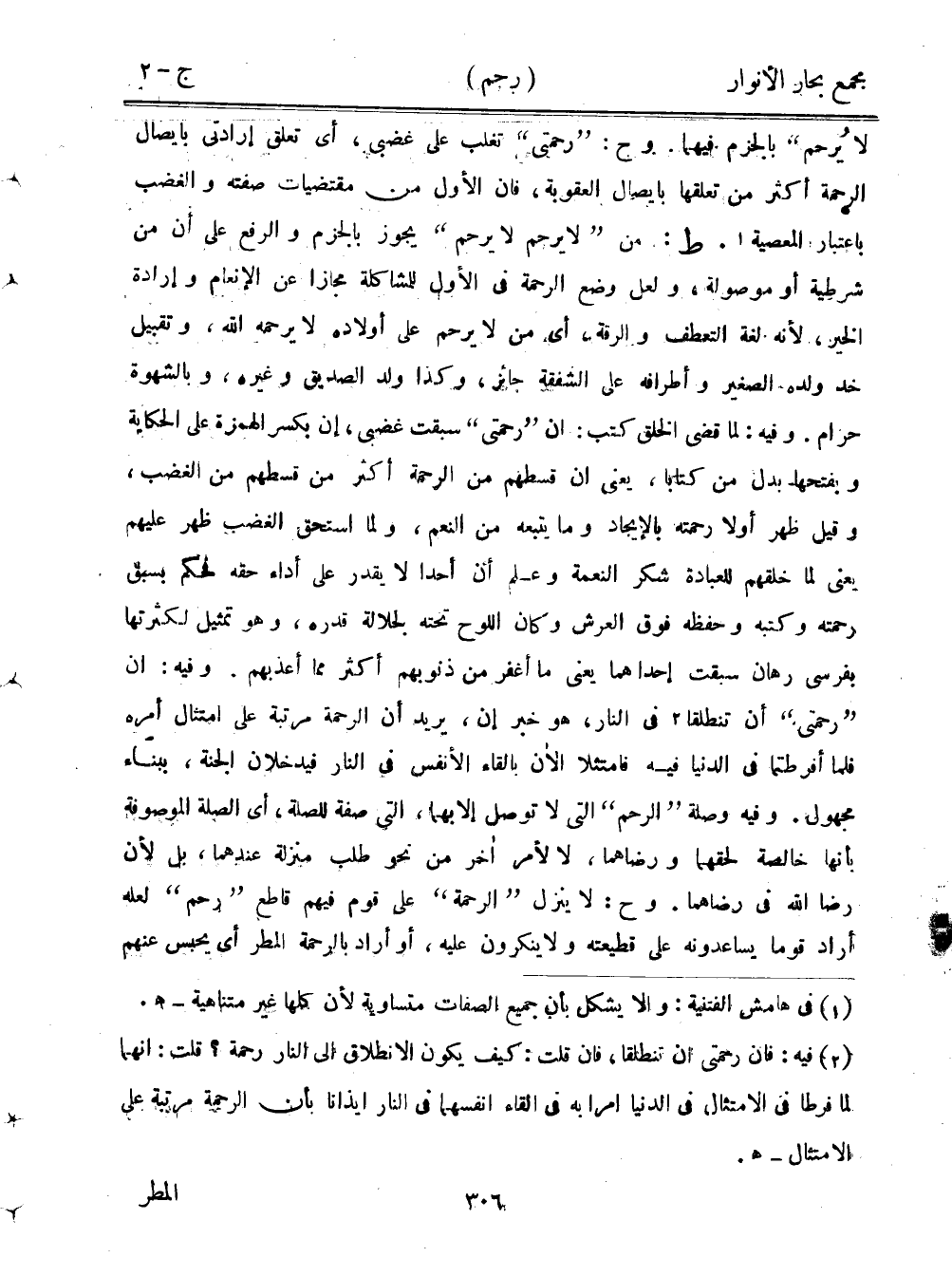 لا يُرحم" بالجزم فيهما. وح: "رحمتي" تغلب على غضبي، أي تعلق إرادتي بإيصال الرحمة أكثر من تعلقها بإيصال العقوبة، فإن الأول من مقتضيات صفته والغضب باعتبار المعصية. ط: من "لا يرحم لا يرحم" يجوز بالجزم والرفع على أن من شرطية أو موصولة، ولعل وضع الرحمة في الأول للمشاكلة مجازًا على الإنعام وإرادة الخير، لأنه لغة التعطف والرقة، أي من لا يرحم على أولاده لا يرحمه الله، وتقبيل خد ولده الصغير وأطرافه على الشفقة جائز، وكذا ولد الصديق وغيره، وبالشهوة حرام. وفيه: لما قضى الخلق كتب: أن "رحمتي" سبقت غضبي، إن بكسر الهمزة على الحكاية وبفتحها بدل من كتابا، يعني أن قسطهم من الرحمة أكثر من قسطهم من الغضب، وقيل ظهر أولًا رحمته بالإيجاد وما يتبعه من النعم، ولما استحق الغضب ظهر عليهم يعني لما خلقهم للعبادة شكر النعمة وعلم أن أحدًا لا يقدر على أداء حقه فحكم بسبق رحمته وكتبه وحفه فوق العرش وكان اللوح تحته لجلالة قدره، وهو تمثيل لكثرتها بفرسي رهان سبقت إحداهما يعني ما أغفر من ذنوبهم أكثر مما أعذبهم. وفيه: أن "رحمتي" أن تنطلقا في النار، هو خبر إن، يريد أن الرحمة مرتبة على امتثال أمره فلما أفرطتما في الدنيا فيه فامتثلا الآن بإلقاء الأنفس في النار فيدخلان الجنة، ببناء مجهول. وفيه وصلة "الرحم" التي لا توصل إلا بهما، التي صفة للصلة، أي الصلة الموصوفة بأنها خالصة لحقهما ورضاهما، لا لأمر أخر من نحو طلب منزلة عندهما، بل لأن رضا الله في رضاهما. وح لا ينزل "الرحمة" على قوم فيهم قاطع "رحم" لعله أراد قومًا يساعدونه على قطيعته ولا ينكرون عليه، أو أراد بالرحمة المطر أي يحبس عنهم