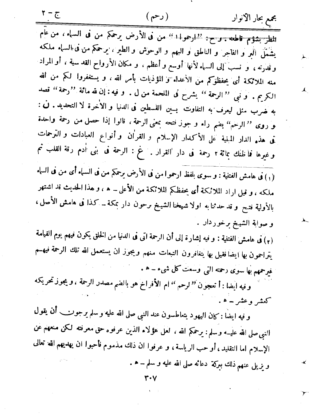 المطر بشؤم قاطعه. وح: "ارحموا" من في الأرض يرحمكم من في السماء، من عام يشمل البر والفاجر والناطق والبهم والوحوش والطير، يرحمكم من في السماء ملكه وقدرته، ونسب إلى السماء لأنها أوسع وأعظم، ومكان الأرواح القدسية، أو المراد منه الملائكة أي يحفظوكم من الأعداء والمؤذيات بأمر الله، ويستغفروا لكم من الله الكريم. ونبي "الرحمة" بشرح في الملحمة من ل. وفيه: إن لله مائة "رحمة" قصد به ضرب مثل ليعرف به التفاوت بين القسطين في الدنيا والآخرة لا التحديد. ن: وروى "الرحم" بضم راء وجوز فتحه بمعنى الرحمة، قالوا إذا حصل من رحمة واحدة في هذه الدار المبنية على الأكدار الإسلام والقرآن وأنواع العبادات والترحمات وغيرها فما نك بمائة رحمة في دار القرار. غ: الرحمة في بني آدم رقة القلب ثم