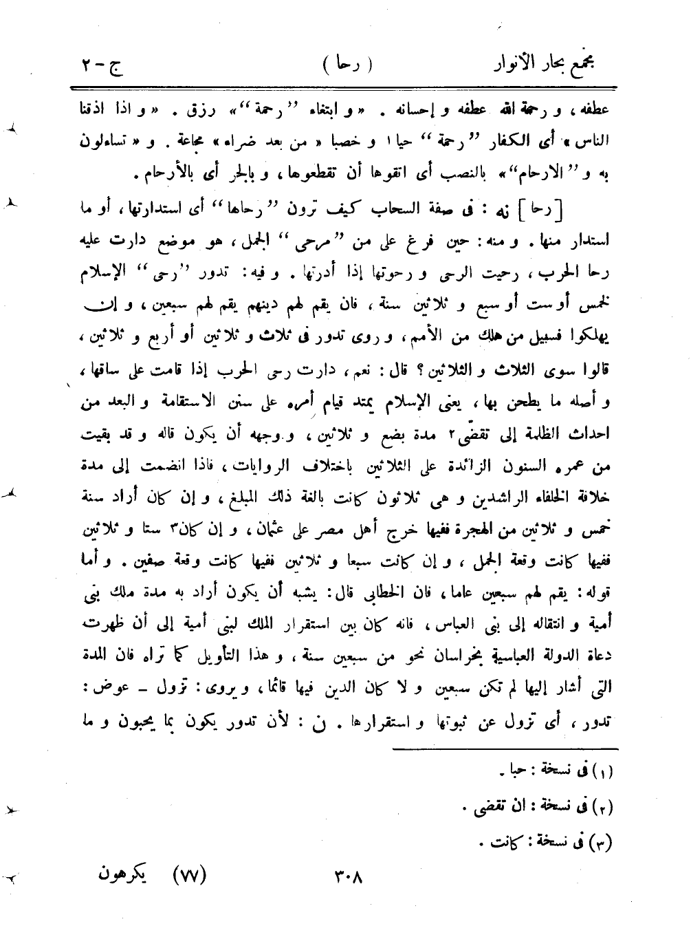 [رحا] نه: في صفة السحاب كيف ترون "رحاها" أي استدارتها، أو ما استدار منها. ومنه: حين فرغ على من "مرحى" الجمل، هو موضع دارت عليه رحا الحرب، رحيت الرحى ورحوتها إذا أدرتها. وفيه: تدور "رحى" الإسلام لخمس أو ست أو سبع وثلاثين سنة، فإن يقم لهم دينهم يقم لهم سبعين، وإن يهلكوا فسبيل من هلك من الأمم، وروى تدور في ثلاث وثلاثين أو أربع وثلاثين، قالوا سوى الثلاث والثلاثين؟ قال: نعم، دارت رحى الحرب إذا قامت على ساقها، وأصله ما يطحن بها، يعني الإسلام يمتد قيام أمره على سنن الاستقامة والبعد من أحداث الظلمة إلى تقضي مدة بضع وثلاثين، ووجهه أن يكون قاله وقد بقيت من عمره السنون الزائدة على الثلاثين باختلاف الروايات، فإذا انضمت إلى مدة خلافة الخلفاء الراشدين وهي ثلاثون كانت بالغة ذلك المبلغ، وإن كان أراد سنة خمس وثلاثين من الهجرة ففيها خرج أهل مصر على عثمان، وإن كانستًا وثلاثين ففيها كانت وقعة الجمل، وإن كانت سبعًا وثلاثين ففيها كانت وقعة صفين. وأما قوله يقم لهم سبعين عامًا، فإن الخطابي قال: يشبه أن يكون أراد به مدة ملك بني أمية وانتقاله إلى بني العباس، فإنه كان بين استقرار الملك لبني أمية إلى أن ظهرت دعاة الدولة العباسية بخراسان نحو من سبعين سنة، وهذا التأويل كما تراه فإن المدة التي أشار إليها لم تكن سبعين ولا كان الدين فيها قائمًا، ويروى: تزول - عوض: تدور، أي تزول عن ثبوتها واستقرارها. ن: لأن تدور يكون بما يحبون وما