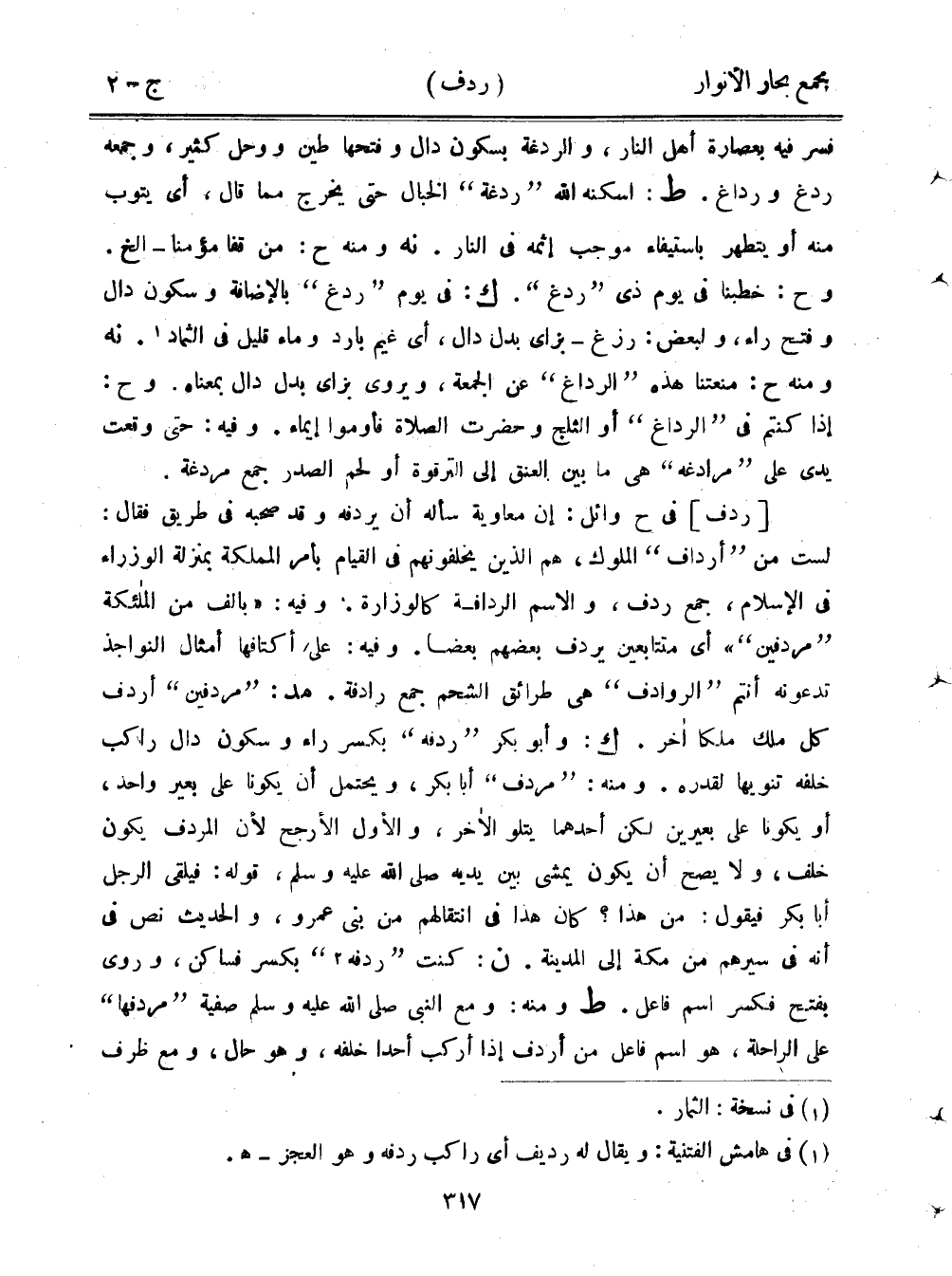 [ردف] في ح وائل: إن معاوية سأله أن يردفه وقد صحبه في طريق فقال: لست من "أرداف" الملوك، هم الذي يخلفونهم في القيام بأمر المملكة بمنزلة الوزراء في الإسلام، جمع ردف، والاسم الردافة كالوزارة. وفيه: "بألف من الملائكة "مردفين"" أي متتابعين يردف بعضهم بعضًا. وفيه: على أكتافها أمثال النواجذ تدعونه أنتم "الروادف" هي طرائق الشحم جمع رادفة. مد: "مردفين" أردف كل ملك ملكًا اخر. ك: وأبو بكر "ردفه" بكسر راء وسكون دال راكب خلفه تنويها لقدره. ومنه: "مردف" أبا بكر، يحتمل أن يكونا على بعير واحد، أو يكونا على بعيرين لكن أحدهما يتلو الآخر، والأول الأرجح لأن المردف يكون خلف، ولا يصح أن يكون يمشي بين يديه صلى الله عليه وسلم، قوله: فيلقى الرجل أبا بكر فيقول: من هذا كان هذا في انتقالهم من بني عمرو، والحديث نص في أنه في سيرهم من مكة إلى المدينة. ن: كنت "ردفه" بكسر فساكن، وروى بفتح فكسر اسم فاعل. ط ومنه: ومع النبي صلى الله عليه وسلم صفية "مردفها" على الراحلة، هو اسم فاعل من أردف إذا أركب أحدًا خلفه، وهو حال، ومع ظرف