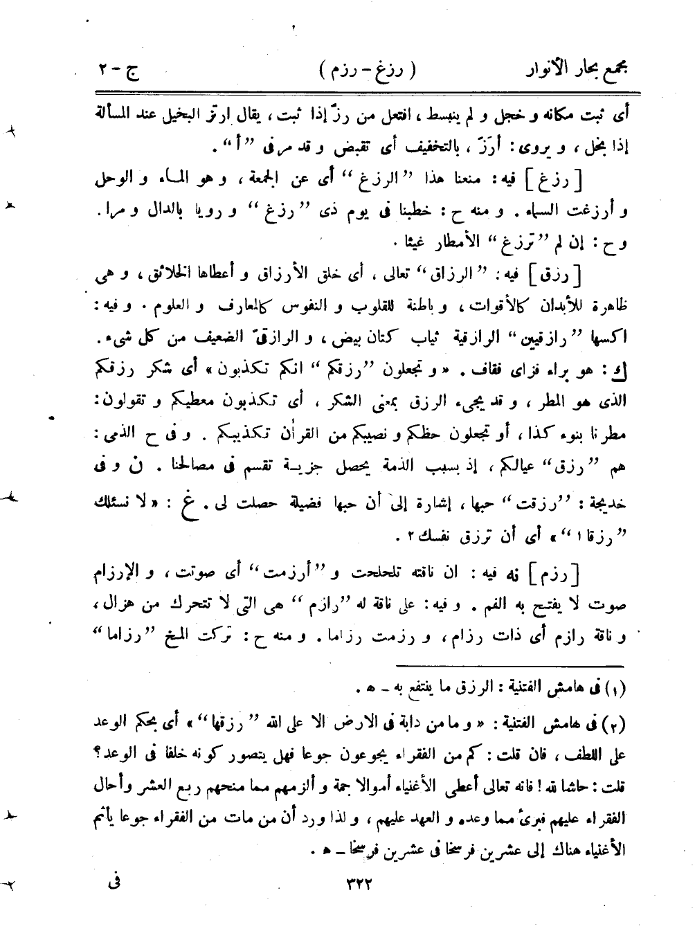 [رزق] فيه: "الرزاق" تعالى، أي خلق الأرزاق وأعطاها الخلائق، وهي ظاهرة للأبدان كالأقوات، وباطنة للقلوب والنفوس كالمعارف والعلوم. وفيه: اكسها "رازقيين" الرازقية ثياب تان بيضن والرازقي الضعيف من كل شيء. ك: هو براء فزاي فقاف. "وتجعلون "رزقكم" أنكم تكذبون" أي شكر رزقكم الذي هو المطر، وقد يجيء الرزق بمعنى الشكر، أي تكذبون معطيكم وتقولون: مطرنا بنوء كذا، أو تجعلون حكم ونصيبكم من القرآن تكذيبكم. وفي ح الذمي: هم "رزق" عيالكم، إذا بسبب الذمة يحصل جزية تقسم في مصالحنا. ن وفي خديجة: "رزقت" حبها، غشارة إلى أن حبها فضيلة حصلت لي. غ: "لا نسئلك" رزقا"" أي أن ترزق نفسك.