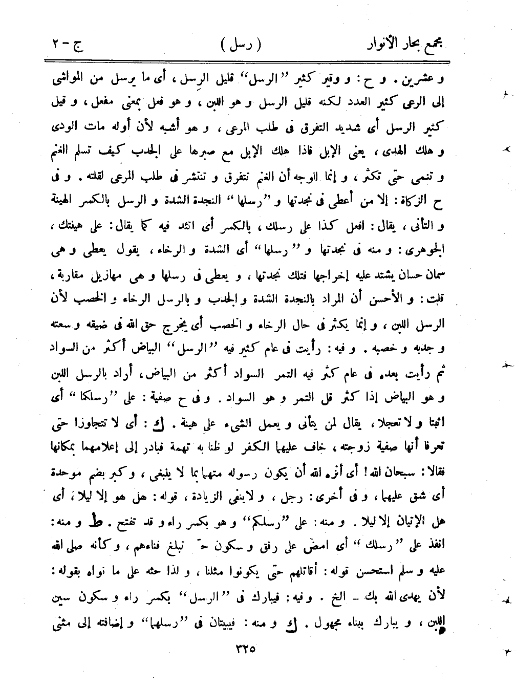 وعشرين. وح: ووقير كثير "الرسل" قليل الرسل، أي ما يرسل من المواشي إلى الرعي كثير العدد لكنه قليل الرسل وهو اللبن، وهو فعل بمعنى مفعل، وقيل كثير الرسل أي شديد التفرق في طلب المرعي، وهو أشبه لأن أوله مات الودى وهلك الهدى، يعني الإبل فإذا هلك الإبل مع صبرها على الجدب كيف تسلم الغنم وتنمي حتى تكثر، وإنما الوجه أن الغنم تتفرق وتنتشر في طلب المرعى لقلته. وفي ح الزكاة: إلا من أعطى في نجدتها و"رسلها" النجدة الشدة والرسل بالكسر الهينة والتأني، يقال: افعل كذا على رسلك، بالكسر أي اتئد فيه كما يقال: على هينتك، الجوهري: ومنه في نجدتها و"رسلها" أي الشدة والرخاء، يقول يعطي وهي سمان حسان يشتد عليه إخراجها فتلك نجدتها، ويعطي في رسلها وهي مهازيل مقاربة، قلت: والحسن أن المراد بالنجدة الشدة والجدب وبالرسل الرخاء والخصب لأن الرسل اللبن، وإنما يكثر في حال الرخاء والخصب أي يخرج حق الله في ضيقه وسعته وجدبه وخصبه. وفيه: رأيت في عام كثير فيه "الرسل" البياض أكثر من السواد ثم رأيت بعده في عام كثر فيه التمر السواد أكثر من البياض، أراد بالرسل اللبن وهو البياض إذا كثر قل التمر وهو السواد. وفي ح صفية: على "رسلكما" أي اثبتا ولا تعجلا، يقال لمن يتأنى ويعمل الشيء على هينة. ك: أي لا تتجاوزا حتى تعرفا أنها صفية زوجته، خاف عليهما الكفر لو ظنا به تهمة فبادر إلى إعلامهما بمكانها فقالا: سبحان الله! أي أنزه الله أن يكون رسوله متهمًا بما لا ينبغي، وكبر بضم موحدة أي شق عليهما، وفي أخرى: رجل، ولا ينفي الزيادة، قوله: هل هو إلا ليلا، أي هل الإتيان غلا ليلا. ومنه: على "رسلكم" وهو بكسر راء وقد تفتح. ط ومنه: أنفذ على "رسلك" أي امض على رفق وسكون حتى تبلغ فناءهم، وكأنهم صلى الله عليه وسلم استحسن قوله: أقاتلهم حتى يكونوا مثلنا، ولذا حثه على ما نواه بقوله: لأن يهدي الله بك - إلخ. وفيه: فيبارك في "الرسل" بكسر راء وسكون سين اللبن، ويبارك ببناء مجهول. ك ومنه: فيبيتان في "رسلهما" وإضافته إلى مثنى