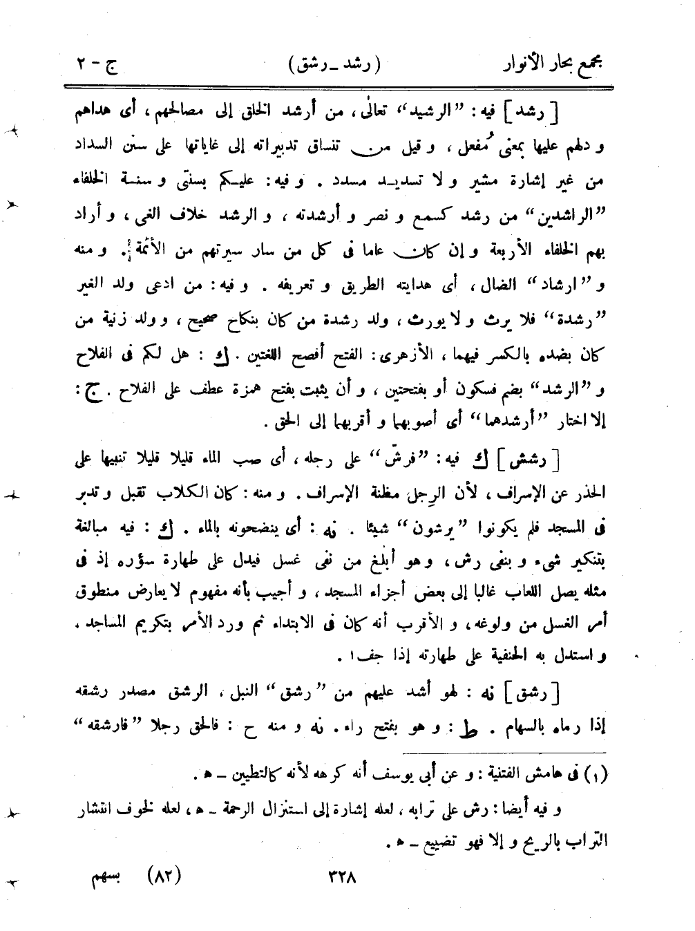 [رشد] فيه: "الرشيد" تعالى، من أرشد الخلق على مصالحهم، أي هداهم ودلهم عليها بمعنى مُفعل، وقيل من تنساق تدبيراته إلى غاياتها على سنن السداد من غير إشارة مشير ولا تسديد مسدد. وفيه: عليكم بسنتي وسنة الخلفاء "الراشدين" من رشد كسمع ونصر وأرشدته، والرشد خلاف الغي، وأراد بهم الخلفاء الأربعة وإن كان عامًا في كل من سار سيرتهم من الأئمة. ومنه و"إرشاد" الضال، أي هدايته الطريق وتعريفه. وفيه: من ادعى ولد الغير "رشدة" فلا يرث ولا يورث، ولد رشدة من كان بنكاح صحيح، وولد زنية من كان بضده بالكسر فيهما، الأزهري: الفتح أفصح اللغتين. ك: هل لكم في الفلاح و"الرشد" بضم فسكون أو بفتحتين، وأن يثبت بفتح همزة عطف على الفلاح. ج: إلا اختار "أرشدهما" أي أصوبهما وأقربهما إلى الحق.