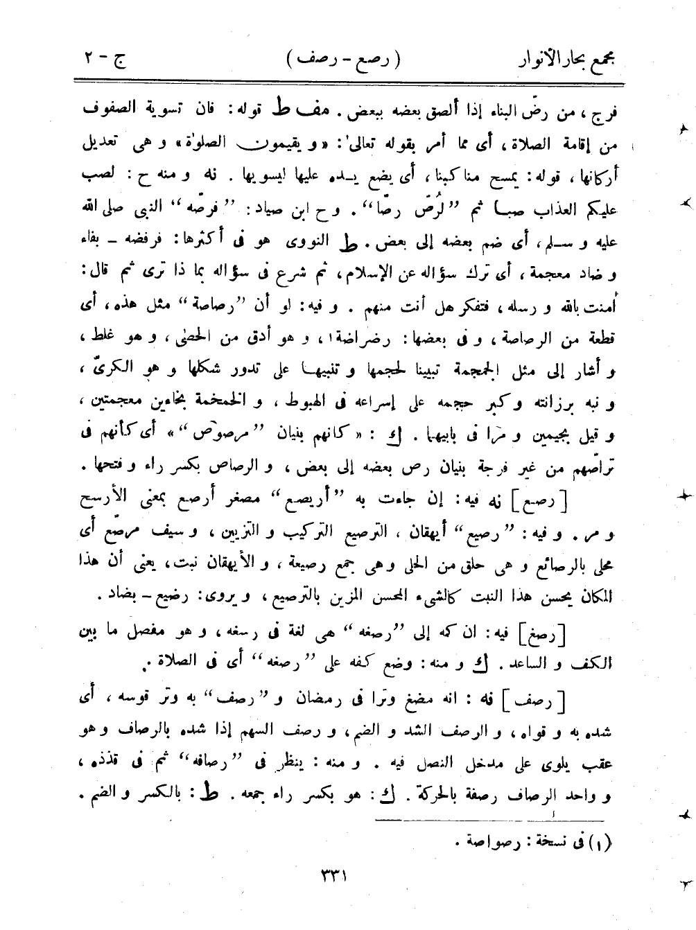 فرج، من رض البناء ذا ألصق بعضه ببعض. مف ط قوله: فإن تسوية الصفوف من إقامة الصلاة، أي مما أمر بقوله تعالى: "ويقيمون الصلاة" وهي تعديل أركانها، قوله: يمسح مناكبنا، أي يضع يده عليها ليسويها. نه ومنه ح: لصب عليكم العذاب صبا ثم "لرص رصا". وح ابن صياد: "فرصه" النبي صلى الله عليه وسلم، أي ضم بعضه إلى بعض. ط النووي هو في أثرها: فرفضه- بفاء وضاد معجمة، أي ترك سؤاله عن الإسلام، ثم شرع في سؤاله بماذا ترى ثم قال: أمنت بالله ورسله، فتفر هل أنت منهم. وفيه: لو أن "رصاصة" مثل هذه، أي قطعة من الرصاصة، وفي بعضها: رضراضة، وهو أدق من الحصى، وهو غلط، وأشار على مثل الجمجمة تبيينا لحجمها وتنبيهًا على تدور شكلها وهو الكرى، ونبه برزانته وكبر حجمه على إسراعه في الهبوط، والخمخمة بخاءين معجمتين، وقيل بجيمين ومرا في بابيهما. ك: "كأنهم بنيان "مرصوص"" أي كأنهم في تراصهم من غر فرجة بنيان رص بعضه إلى بعض، والرصاص بكسر راء وفتحها.