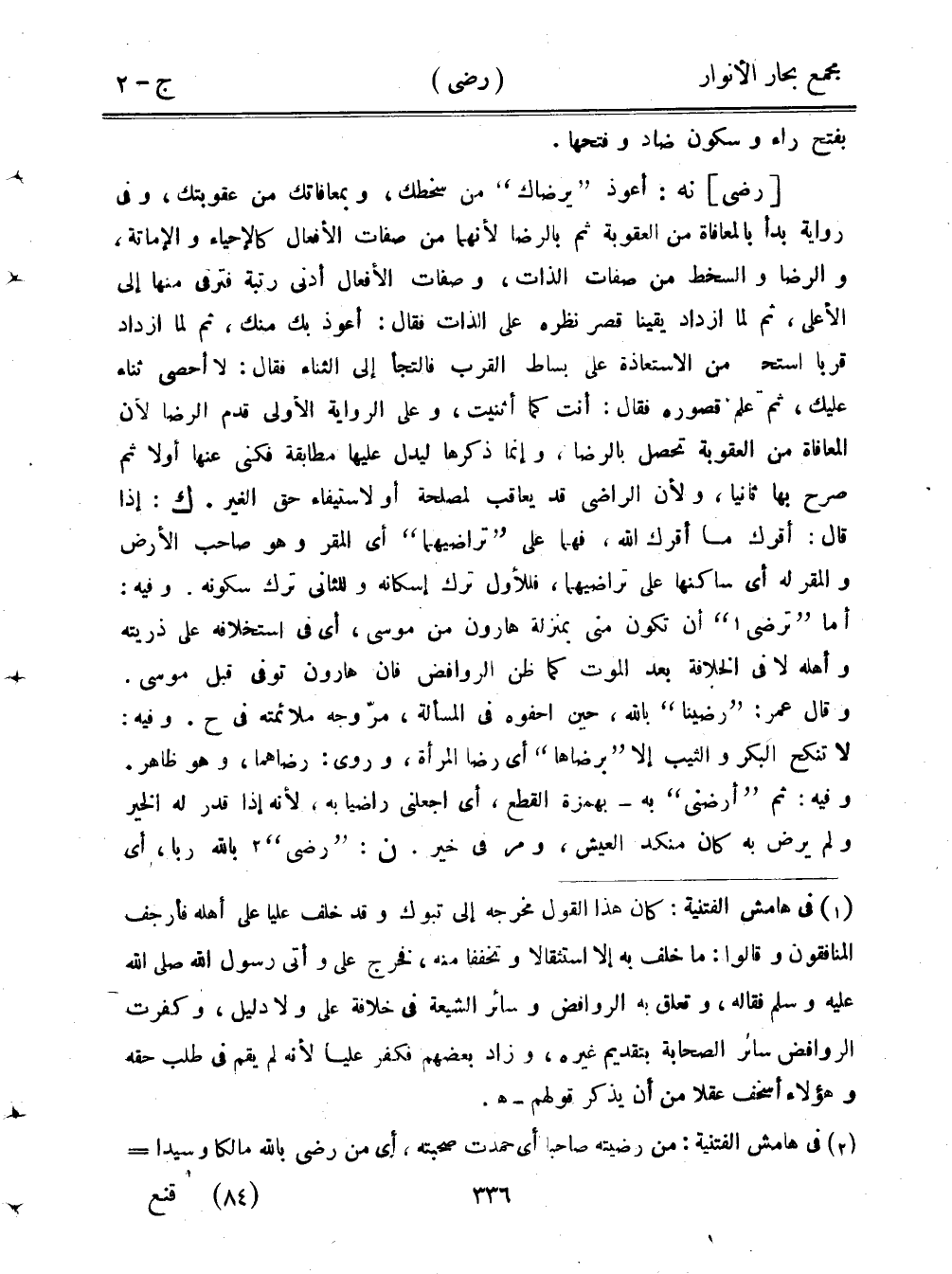 [رضى] نه: أعوذ "برضاك" من سخطك، وبمعافاتك من عقوبتك، وفي رواية بدأ بالمعافاة من العقوبة ثم بالرضا لأنهما من صفات الأفعال كالإحياء والإماتة، والرضا والسخط من صفات الذات، وصفات الأفعال أدنى رتبة فترقى منها إلى الأعلى، ثم لما ازداد يقينًا قصر نره على الذات فقال: أعوذ بك منك، ثم لما ازداد قربًا استحق من الاستعاذة على بساط القرب فالتجأ إلى الثناء فقال: لا أحصى ثناء عليك، ثم علم قصوره فقال أنت كما أثنيت، وعلى الرواية الأولى قدم الرضا لأن المعافاة من العقوبة تحصل بالرضا، وإنما ذكرها ليدل عليها مطابقة فكنى عنها أولا ثم صرح بها ثانيا، ولأن الراضي قد يعاقب لمصلحة أو لاستيفاء حق الغير. ك: إذا قال: أقرك ما أقرك الله، فهما على "تراضيهما" أي المقر وهو صاحب الأرض والمقر له أي ساكنها على تراضيهما، فللأول ترك إسكانه وللثاني ترك سكونه. وفيه: أما "ترضى" أن تكون مني بمنزلة هارون من موسى، أي في استخلافه على ذريته وأهله لا في الخلافة بعد الموت كما ظن الروافض فإن هارون توفى قبل موسى. وقال عمر: "رضينا" بالله، حين احفوه في المسألة، مر وجه ملائمته في ح. وفيه: لا تنكح البكر والثيب إلا "برضاها" أي رضا المرأة، وروى: رضاهما، وهو ظاهر. وفيه: ثم "أرضني" به- بهمزة القطع، أي اجعلني راضيًا به، لأنه إذا قدر له الخير ولم يرض به كان منكد العيش، ومر في خير. ن: "رضي" بالله ربا، أي