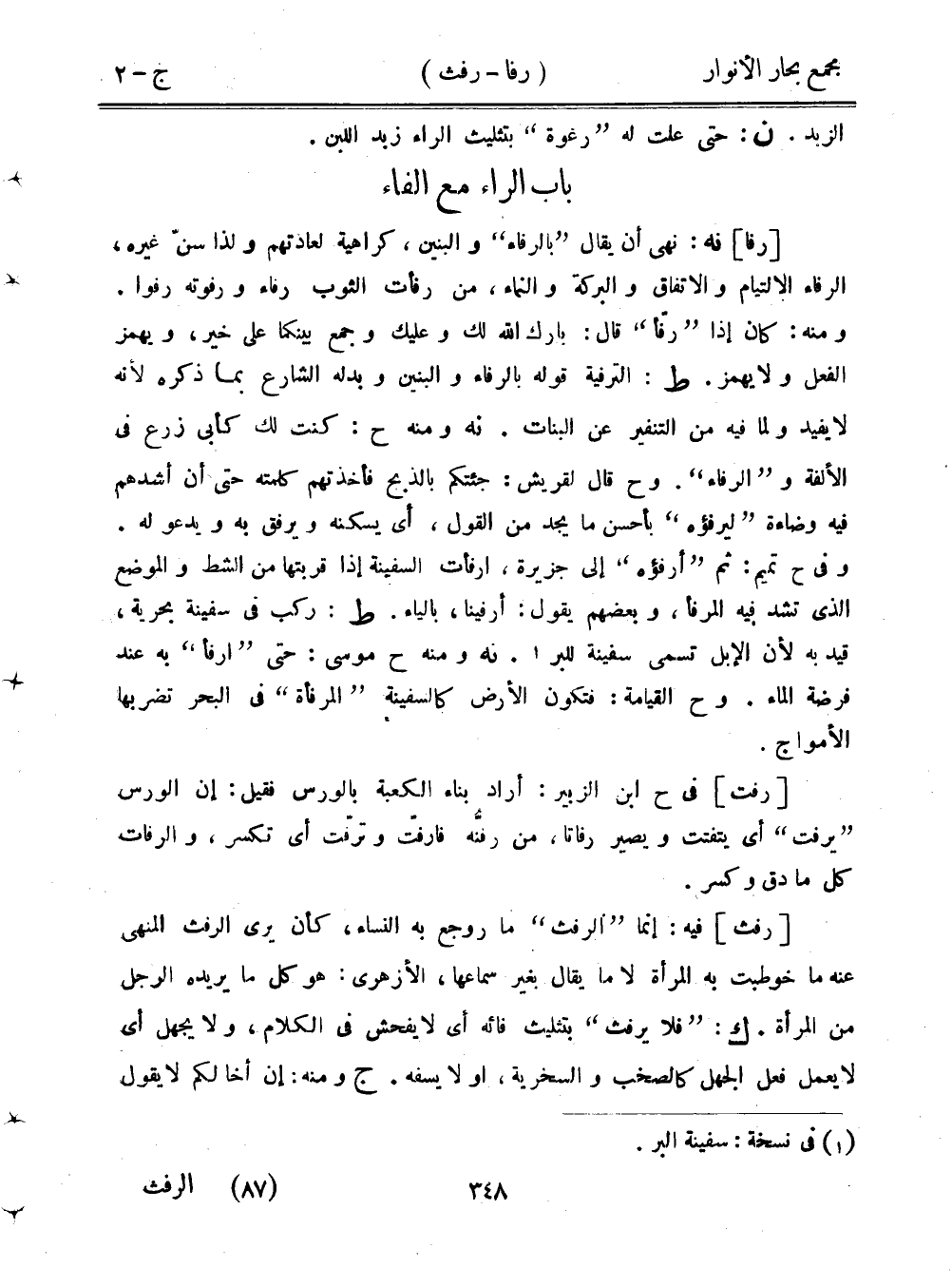 [رفا] نه: نهى أن يقال "بالرفاء" والبنين، كراهية لعادتهم ولذا سن غيره، الرفاء الالتيام والاتفاق والبركة النماء، من رفأت الثوب رفاء ورفوته رفوا. ومنه: كان إذا "رفا" قال: بارك الله ل وعلكي وجمع بينكما على خير، ويهمز الفعل ولا يهمز. ط: الترفية قوله بالرفاء والبنين وبدله الشارع بما ذره لأنه لا يفيد ولما فيه من التنفير عن البنات. نه ومنه ح: كنت لك كأبي زرع في الألفة و"الرفاء". وح قال لقريش: جئتكم بالذبح فأخذتهم كلمته حتى أن أشدهم فيه وضاءة "ليرفؤه" بأحسن ما يجد من القول، أي يسكنه ويرفق به ويدعو له. وفي ح تميم: ثم "أرفؤه" إلى جزيرة، ارفأت السفينة إذا قربتها من الشط والموضع الذي تشد فيه المرفأ، وبعضهم يقول: أرفينا، بالياء. ط: ركب في سفينة بحرية، قيد به لأن الإبل تسمى سفينة للبر. نه ومنه ح موسى: حتى "ارفأ" به عند فرضة الماء. وح القيامة: فتكون الأرض كالسفينة "المرفأة" في البحر تضربها الأمواج.