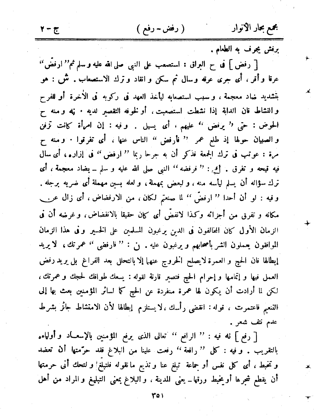 [رفض] في ح البراق: استصعب على النبي صلى الله عليه وسلم ثم "ارفض" عرقا وأقر، أي جرى عرقه وسال ثم سكن وانقاد وترك الاستصعاب. ش: هو بتشديد ضاد معجمة، وسبب استصعابه ليأخذ العهد في ركوبه في الآخرة أو للفرح والنشاط فإن الدابة إذا نشطت استصعبت، أو لخوفه التقصير لديه. نه ومنه ح الحوض حتى "يرفض" عليهم، أي يسيل. وفيه: إن امرأة كانت تزفن والصبيان حولها إذ طلع عمر "فأرفض" الناس عنها، أي تفرقوا. ومنه ح مرة: عوتب في ترك الجمعة فذكر أن به جرحًا ربما "ارفض" في إزاره، أي سال فيه قيحه وتفرق. ك: "فرفضه" النبي صلى الله عليه وسلم - بضاد معجمة، أي ترك سؤاله أن يسلم ليأسه منه، ولبعض بمهملة، ولعله بسين مهملة أي ضربه برجله. وفيه: لو أن أحدًا "ارفض" لما صنعتم لكان، من الارفضاض، أي زال عن مكانه وتفرق من أجزائه وكذا لانفض أي كان حقيقًا بالانفضاض، وغرضه أن في الزمان الأول كان المخالفون في الدين يرغبون المسلمين على الخير وفي هذا الزمان الموافقون يعملون الشر بأصحابهم ويرغبون عليه. ن: "فارفضي" عمرتك، لا يريد إبطالها فإن الحج والعمرة لا يصلح الخروج عنهما إلا بالتحلل بع دالفراغ بل يريد رفض العمل فيها وإتمامها وإحرام الحج فتصير قارنة لقوله: يسعك طوافك لحجك وعمرتك، لكن لماأرادت أن يكون لها عمرة منفردة عن الحج كما لسائر المؤمنين بعث بها إلى التنعيم فاعتمرت، قوله: انقضى رأسك، لا يستلزم إبطالها لأن الامتشاط جائز بشرط عدم نتف شعر.
