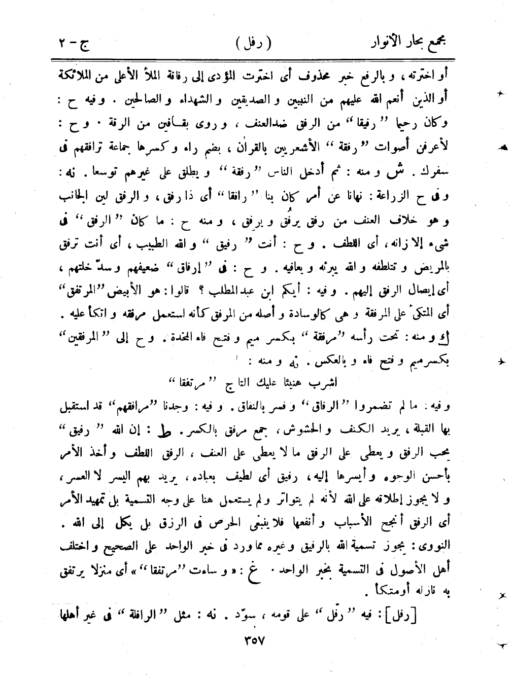أو اخترته، وبالرفع خبر محذوف أي اخترت المؤدى إلى رفافة الملأ الأعلى من الملائكة أو الذين أنعم الله عليهم من النبيين والصديقين والشهداء والصالحين. وفيه ح: وكان رحيمًا "رفيقًا" من الرفق ضد العنف، وروى بقافين من الرقة. وح: لأعرفن أصوات "رفقة" الأشعريين بالقران، بضم راء وكسرها جماعة ترافقهم في سفرك. ش ومنه: ثم أدخل الناس "رفقة" ويطلق على غيرهم توسعا. نه: وفي ح الزراعة: نهانا عن أمر كان بنا "رافقًا" أي ذا رفق، والرفق لين الجانب وهو خلاف العنف من رفق يرفق ويرفق، ومنه ح: ما كان "الرفق" في شيء إلا زانه، أي اللطف. وح: أنت "رفيق" والله الطبيب، أي أنت ترفق بالمريض وتتلطفه والله يبرئه ويعافيه. وح: في "إرفاق" ضعيفهم وسد خلتهم، أي إيصال الرفق إليهم. وفيه: أيكم ابن عبد المطلب؟ قالوا: هو الأبيض "المرتفق" أي المتكئ على المرفقة، وهي كالوسادة وأصله من المرفق كأنه استعمل مرفقه واتكأ عليه. ك ومنه: تحت رأسه "مرفقة" بكسر ميم وفتح فاء المخدة. وح إلى "المرفقين" بكسر ميم وفتح فاء وبالعكس. نه ومنه: