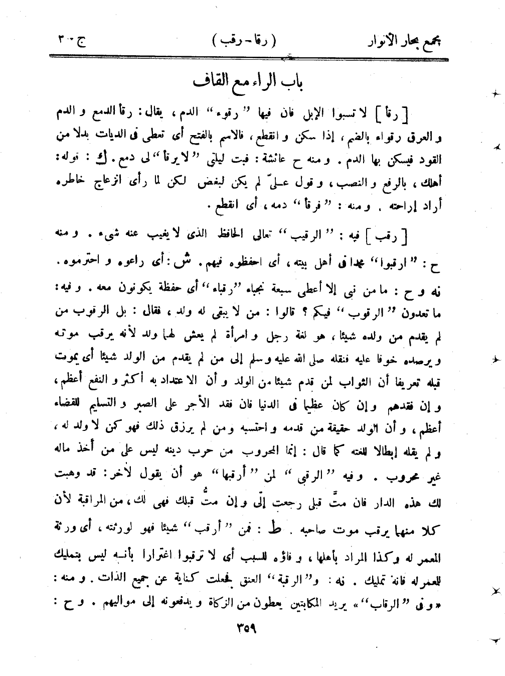 [رقب] فيه: "الرقيب" تعالى الحافظ الذي لا يغيب عنه شيء. منه ح: "ارقبوا" محمدًا في أهل بيته، أي احفظوه فيهم. ش: أي راعوه واحترموه. نه وح: ما من نبي إلا أعطى سبعة نجباء "رقباء" أي حفظة يكونون معه. وفيه: ما تعدون "الرقوب" فيكم؟ قالوا: من لا يبقى له ولد، فقال: بل الرقوب من لم يقدم من ولده شيئًا، هو لغة رجل وامرأة لم يعش لهما ولد لأنه يرقب موته ويرصده خوفًا عليه فنقله صلى الله عليه وسلم إلى من لم يقدم من الولد شيئًا أي يموت قبله تعريفًا أن الثواب لمن قدم شيئًا من الولد وأن الاعتداد به أكثر والنفع أعظم، وإن فقدهم وإن كان عظيمًا في الدنيا فإن فقد الأجر على الصبر والتسليم للقضاء أعظم، وأن الولد حقيقة من قدمه واحتبسه ومن لم يرزق ذل فهو كمن لا ولد له، ولم يقله إبطالًا للغته كما قال: إنما المحروب من حرب دينه ليس على من أخذ ماله غير محروب. وفيه "الرقبى" لمن "أرقبها" هو أن يقول لآخر: قد وهبت لك هذه الدار فإن مت قبل رجعت إلىّ وإن مت قبلك فهي لك، من المراقبة لن كلا منهما يرقب موت صاحبه. ط: فمن "أرقب" شيئًا فهو لورثته، أي ورثة المعمر له وكذا المراد بأهلها، وفاؤه للسبب أي لا ترقبوا اغترار بأنه ليس بتمليك للمعمر له فإنه تمليك. نه: و"الرقبة" العنق فجعلت كناية عن جميع الذات. ومنه: "وفي "الرقاب"" يريد المكابتين يعطون من الزكاة ويدفعونه إلى مواليهم. وح: