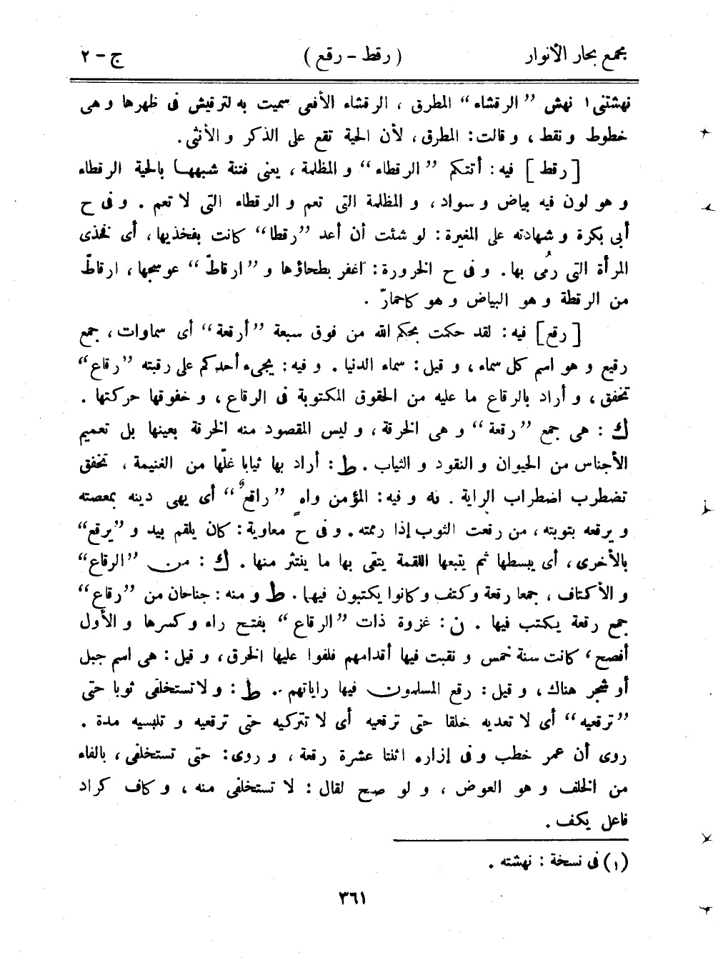 [رقط] فيه: أتتكم "الرقطاء" والملمة، يعني فتنة شبهها بالحية الرقطاء وهو لون فيه بياض وسواد، والملمة التي تعم والرقطاء التي لا تعم. وفي ح أبي بكرة وشهادته على المغيرة: لو شئت أن أعد "رقطًا" كانت بفخذيها، أي فخذي المرأة التي رُمي بها. وفي ح الخرورة: اغفر بطحاؤها و"ارقاط" عوسجها، ارقاط من الرقطة وهو البياض وهو كاحمار.