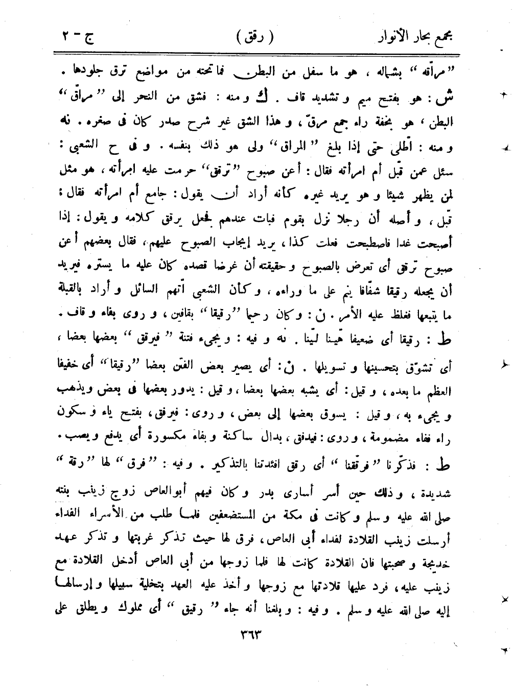 "مراقه" بشماله، هو ما سفل من البطن فما تحته من مواضع ترق جلودها. ش: هو بفتح ميم وتشديد قاف. ك ومنه: فشق من النحر إلى "مراق" البطن، هو بخفة راء جمع مرق، وهذا الشق غير شرح صدر كان في صغره. نه ومنه: اطلي حتى إذا بلغ "المراق" ولى هو ذلك بنفسه. وفي ح الشعبي: سئل عمن قبل أم امرأته فقال: أعن صبوح "ترقق" حرمت عليه امرأته، هو مثل لمن يظهر شيئًا وهو يريد غيره كأنه أراد أن يقول: جامع أم امرأته فقال: قبل، وأصل أن رجلًا نزل بقوم فبات عندهم فجعل يرقق كلامه ويقول: إذا أصبحت غدا فاصطبحت فعلت كذا، يريد إيجاب الصبوح عليهم، فقال بعضهم أعن صبوح ترقق أي تعرض بالصبوح وحقيقته أن غرضًا قصده كان عليه ما يستره فيريد أن يجعله رقيقًا شفافًا ينم على ما وراءه، وكأن الشعبي اتهم السائل وأراد بالقبلة ما يتبعها فغلظ عليه الأمر. ن: وكان رحيمًا "رقيقًا" بقافين، وروى بفاء وقاف. ط: رقيقًا أي ضعيفًا هينًا لينا. نه وفيه: ويجيء فتنة "فيرقق" بعضها بعضًا، أي تشوق بتحسينها وتسويلها. ن: أي يصير بعض الفتن بعضا "رقيقا" أي خفيفا العظم ما بعده، وقيل: أي يشبه بعضها بعضا، وقيل: يدور بعضها في بعض ويذهب ويجيء به، وقيل: يسوق بعضها إلى بعض، وروى: فيرفق، بفتح ياء وسكون راء ففاء مضمومة، وروى: فيدفق، بدال ساكنة وبفاء مكسورة أي يدفع ويصب. ط: فذكرنا "فرققنا" أي رقق أفئدتنا بالتذكير. وفيه: "فرق" لها "رقة" شديدة، وذلك حين أسر أسارى بدر وكان فيهم أبو العاص زوج زينب بنته صلى الله عليه وسلم وكانت في مكة من المستضعفين فلما طلب من الأسراء الفداء أرسلت زينب القلادة لفداء أبي العاص، فرق لها حيث تذكر غربتها وتذكر عهد خديجة وصحبتها فإن القلادة كانت لها فلما زوجها من أبي العاص أدخل القلادة مع زينب عليه، فرد عليها قلادتها مع زوجها وأخذ عليه العهد بتخلية سبيلها وإرسالها إليه صلى الله عليه وسلم. وفيه: وبلغنا أنه جاء "رقيق" أي مملوك ويطلق على