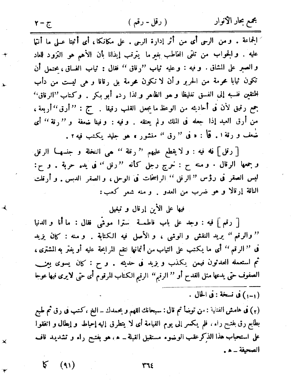 [رقم] فيه: وجد على باب فاطمة سترًا موشى فقال: ما أنا والدنيا "والرقم" يريد النقش والوشى، والأصل فيه الكتابة. ومنه: كان يزيد في "الرقم" أي ما يكتب على الثياب من أثمانها لتقع المرابحة عليه أو يغتر به المشتري، ثم استعمله المحدثون فيمن يكذب ويزيد في حديثه. وح: كان يسوى بين الصفوف حتى يدعها مثل القدح أو "الرقيم" الرقيم الكتاب المرقوم أي حتى لا يرى فيها عوجا