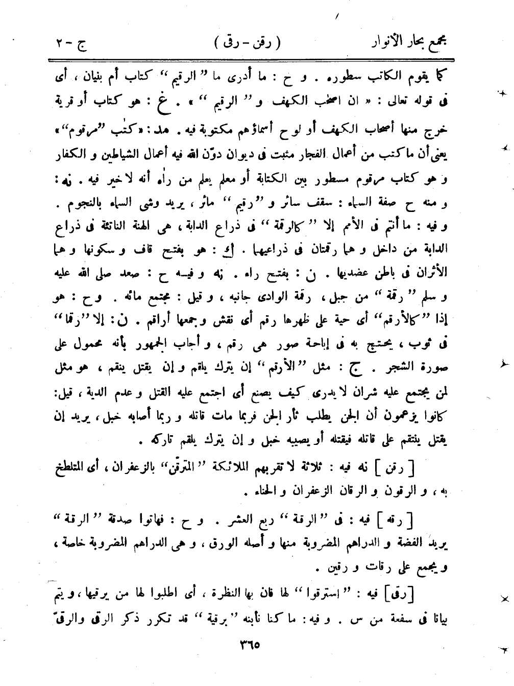 كما يقوم الكاتب سطوره. وح: ما أدري ما "الرقيم" كتاب أم بنيان، أي في قوله تعالى: "إن أصحاب الكهف و"الرقيم"". غ: هو تاب أو قرية خرج منها أصحاب الكهف أو لوح أسماؤهم مكتوبة فيه. مد: "كتب "مرقوم"" يعني أن ما كتب من أعمال الفجار مثبت في ديوان دون الله فيه أعمال الشياطين والكفار وهو كتاب مرقوم مسطور بين الكتابة أو معلم يعلم من رآه أنه لا خير فيه. نه: ومنه ح صفة السماء: سقف سائر و"رقيم" مائر، يريد وشي السماء بالنجوم. وفيه: ما أنتم في الأمم إلا "كالرقمة" في ذراع الدابة، هي الهنة الناتئة في ذراع الدابة من داخل وهما رقمتان في ذراعيهما. ك: هو بفتح قاف وسكونها وهما الأثران في باطن عضديها. ن: بفتح راء. نه وفيه ح: صعد صلى الله عليه وسلم "رقمة" من جبل، رقمة الوادي جانبه، وقيل: مجتمع مائه. وح: هو إذا "كالأرقم" أي حية على ظهرها رقم أي نقش وجمعها أراقم. ن: إلا "رقما" في ثوب، يحتج به في إباحة صور هي رقم، وأجاب الجمهور بأنه محمول على صورة الشجر. ج: مثل "الأرقم" إن يترك يلقم وإن يقتل ينقم، هو مثل لمن يجتمع عليه شران لا يدري كيف يصنع أي اجتمع عليه القتل وعدم الدية، قيل: كانوا يزعمون أن الجن يطلب ثأر الجن فربما مات قاتله وربما أصابه خيل، يريد إن يقتل ينتقم على قاتله فيقتله أو يصيبه خبل وإن يترك يلقم تاركه.