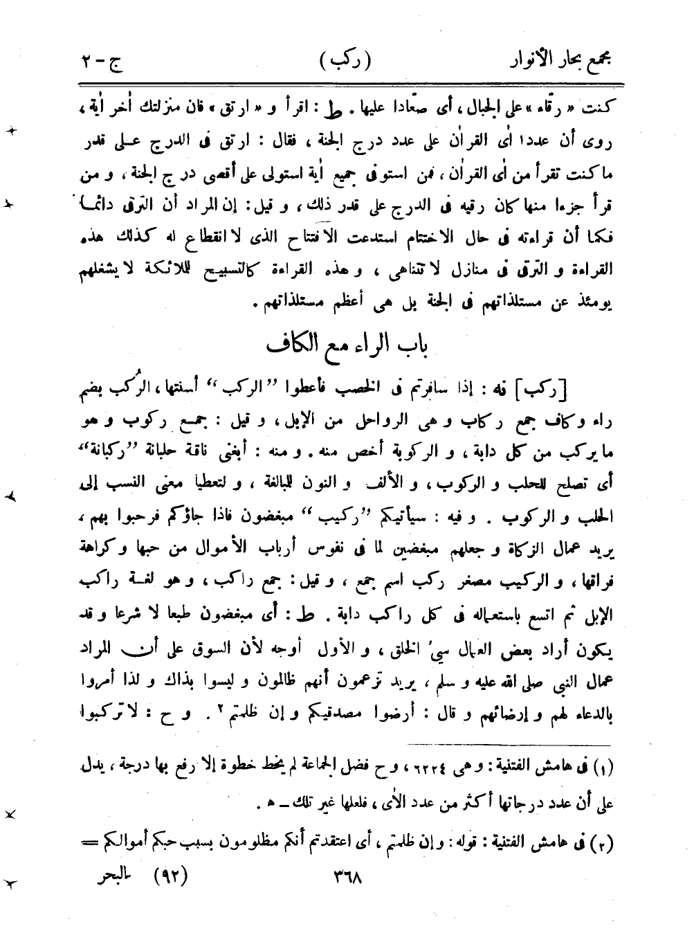 [ركب] نه: إذا سافرتم في الخصب فأعطوا "الركب" أسنتها، الرُكب بضم راء وكاف جمع ركاب وهي الرواحل من الإبل، وقيل: جمع ركوب وهو ما يكرب من كل دابة، والركوبة أخص منه. ومنه: أبغني ناقة حلبانة "ركبانة" أي تصلح للحلب والركوب، والألف والنون للمبالغة، ولتعطيا معنى النسب إلى الحلب والركوب. وفيه: سيأتيكم "ركيب" مبغضون فإذا جاؤكم فرحبوا بهم، يريد عمال الزكاة وجعلهم مبغضين لما في نفوس أرباب الأموال من حبها وكراهة فراقها، والكريب مصغر ركب اسم جمع، وقيل: جمع راكب، وهو لغة راكب الإبل ثم اتسع باستعماله في كل راكب دابة. ط: أي مبغضون طبعًا لا شرعًا وقد يكون أراد بعض العمال سيء الخلق، والأول أوجه لأن السوق على أن المراد عمال النبي صلى الله عليه وسلم، يريد تزعمون أنهم ظالمون وليسوا بذاك ولذا أمروا بالدعاء لهم وإرضائهم وقال: أرضوا مصدقيكم وإن ظلمتم. وح: لا تركبوا