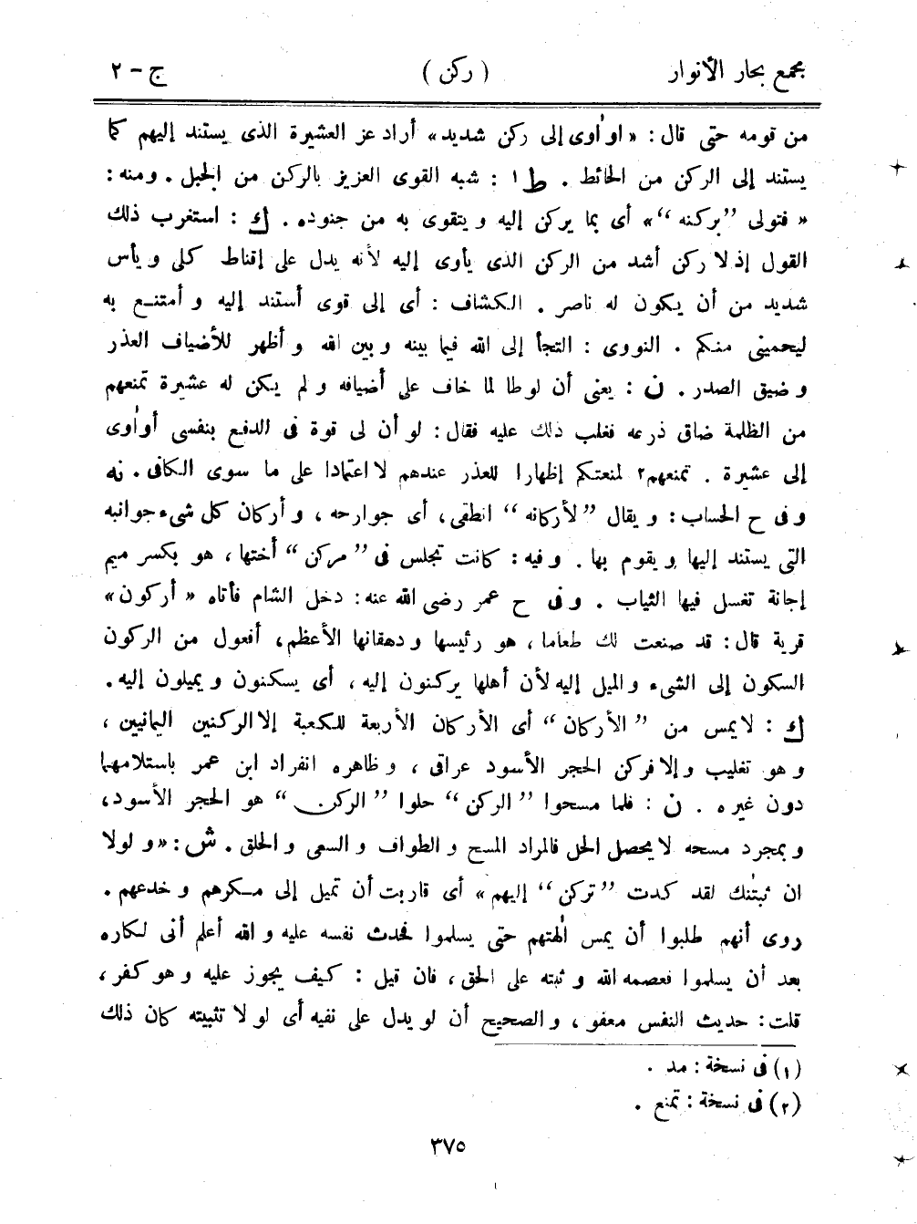 من قومه حتى قال: "أو آوي إلى ركن شديد" أراد عز العشيرة الذي يستند إليهم كما يستند إلى الركن من الحائط. ط: شبه القوى العزيز بالركن من الجبل. ومنه: "فتولى "بركنه"" أي بما يركن إليه ويتقوى به من جنوده. ك: استغرب ذلك القول إذ لا ركن أشد من الركن الذي يأوي إليه لأنه يدل على إقناط كلي ويأس شديد من أن يكون له ناصر. الكشاف: أي إلى قوى أستند إليه وأمتنع به ليحميني منكم. النووي: التجأ إلى الله فيما بينه وبين الله وأظهر للأضياف العذر وضيق الصدر. ن: يعني أن لوطًا لما خاف على أضيافه ولم يكن له عشيرة تمنعهم من الظلمة ضاق ذرعه فغلب ذلك عليه فقال: لو أن لي قوة في الدفع بنفسي أو آوي إلى عشيرة. تمنعهم لمنعتكم إظهارًا للعذر عندهم لا اعتمادًا على ما سوى الكافي. نه وفي ح الحساب: ويقال "لأركانه" انطقي، أي جوارحه، وأركان كل شيء جوانبه التي يستند إليها ويقوم بها. وفيه: كانت تجلس في "مركن" أختها، هو بكسر ميم إجانة تغسل فيها الثياب. وفي ح عمر رضي الله عنه: دخل الشام فأتاه "أركون" قرية قال: قد صنعت لك طعامًا، هو رئيسها ودهقانها الأعظم، أفعول من الركون السكون إلى الشيء والميل إليه لأن أهلها يركنون إليه، أي يسكنون ويميلون إليه. ك: لا يمس من "الأركان" أي الأركان الأربعة للكعبة إلا الركنين اليمانيين، وهو تغليب وإلا فركن الحجر الأسود عراقي، وظاهره انفراد ابن عمر باستلامهما دون غيره. ن: فلما مسحوا "الركن" حلوا "الركن" هو الحجر الأسود، وبمجرد مسحه لا يحصل الحل فالمراد المسح والطواف والسعي والحلق. ش: "ولولا أن ثبتناك لقد كدت "تركن" إليهم" أي قاربت أن تميل إلى مكرهم وخدعهم. روى أنهم طلبوا أن يمس آلهتهم حتى يسلموا فحدث نفسه عليه والله أعلم أني لكاره بعد أن يسلموا فعصمه الله وثبته على الحق، فإن قيل: كيف يجوز عليه وهو كفر، قلت: حديث النفس معفو، والصحيح أن لو يدل على نفيه أي لولا تثنيته كان ذلك