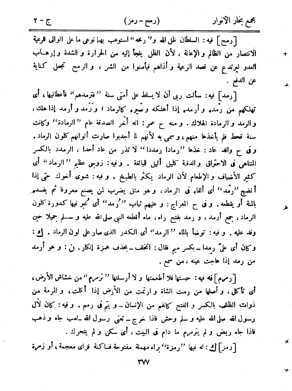 [رمد] فيه: سألت ربي أن لا يسلط على أمتي سنة "فترمدهم" فأعطانيها، أي تهلكهم من رمده وأرمده إلى أهلكه وصيره كالرماد، ورمد وأرمد إذا هلك، والرمد والرمادة الهلاك. ومنه ح عمر: أنه أخر الصدقة عام "الرمادة" وكانت سنة قحط فلم يأخذها منهم، وسمي به لأنهم لما أجدبوا صارت ألوانهم كلون الرماد. وفي ح وافد عاد: خذها "رمادًا رمددًا" لا تذر من عاد أحدًا، الرمدد بالكسر المتناهي في الاحتراق والدقة كليل أليل للمبالغة. وفيه: زوجي عظيم "الرماد" أي كثير الأضياف والإطعام لأن الرماد يكثر بالطبخ. وفيه: شوى أخوك حتى إذا أنضج "رمد" أي ألقاه في المراد، وهو مثل يضرب لمن يصنع معروفًا ثم يفسده بالمنة أو يقطعه. وفي ح المعراج: وعليهم ثياب "رُمد" أي غُبر فيها كدورة كلون الرماد، جمع أرمد، ورمد بفتح راء، ماء أقطعه النبي صلى الله عليه وسلم جميلًا حين وفد عليه. وفيه: توضأ بالماء "الرمد" أي الدر الذي صار على لون الرماد. ك: وكان أي عليّ رمدا- بكسر ميم فقال: اتخلف - بحذف همزة إنكار. ن: وهو أرمد من رمد إذا هاجت عينه من سمع.