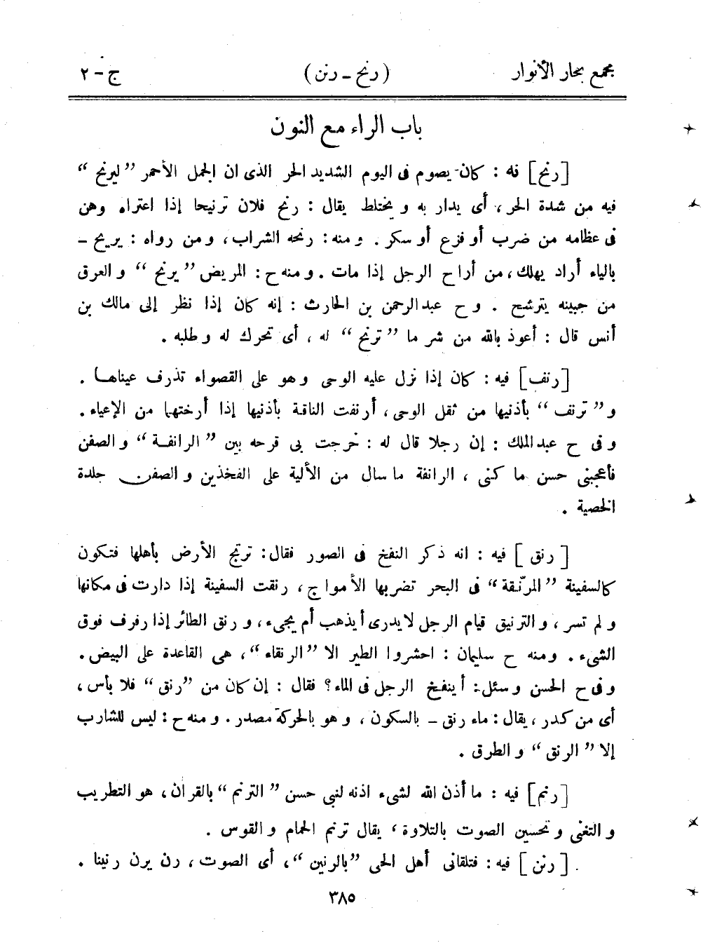 [رنم] فيه: ما أذن الله لشيء إذنه لنبي حسن "الترنم" بالقرآن، هو التطريب والتغني وتحسين الصوت بالتلاوة، يقال ترنم الحمام والقوس.