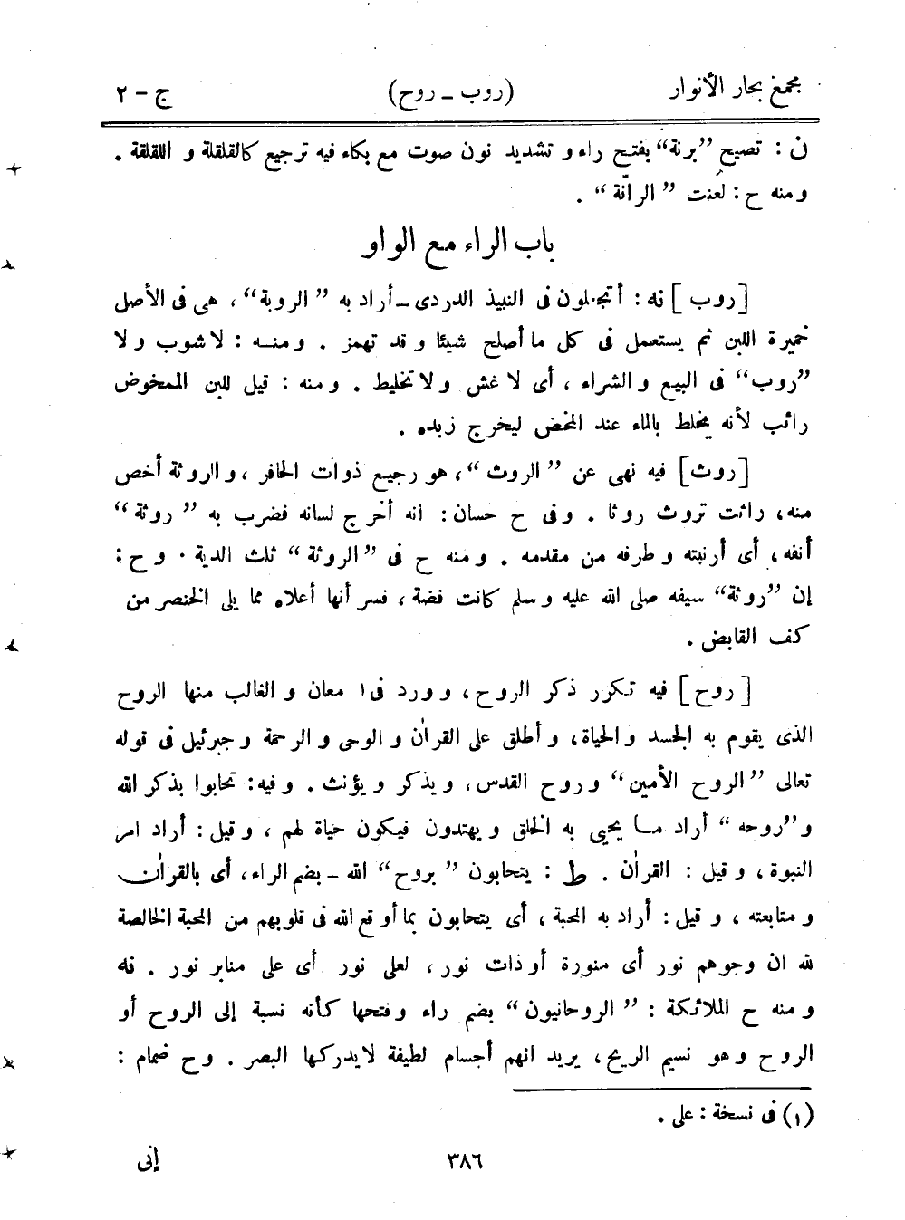 [روح] فيه تكرر ذكر الروح، وورد في معان والغالب منها الروح الذي يقوم به الجسد والحياة، وأطلق على القرآن والوحي والرحمة وجبرئيل في قوله تعالى "الروح الأمين" وروح القدس، ويذكر ويؤنث. وفيه: تحابوا بذكر الله و"روحه" أراد ما يحيى به الخلق ويهتدون فيكون حياة لهم، وقيل: أراد أمر النبوة، وقيل: القرآن. ط: يتحابون "بروح" الله - بضم الراء، أي بالقرآن ومتابعته، وقيل: أراد به المحبة، أي يتحابون بما أوقع الله في قلوبهم من المحبة الخالصة لله أن وجوههم نور أي منورة أو ذات نور، لعلى نور أي على منابر نور. نه ومنه ح الملائكة: "الروحانيون" بضم راء وفتحها كأنه نسبة إلى الروح أو الروح وهو نسيم الريح، يريد أنهم أجسام لطيفة لا يدركها البصر. وح ضمام: