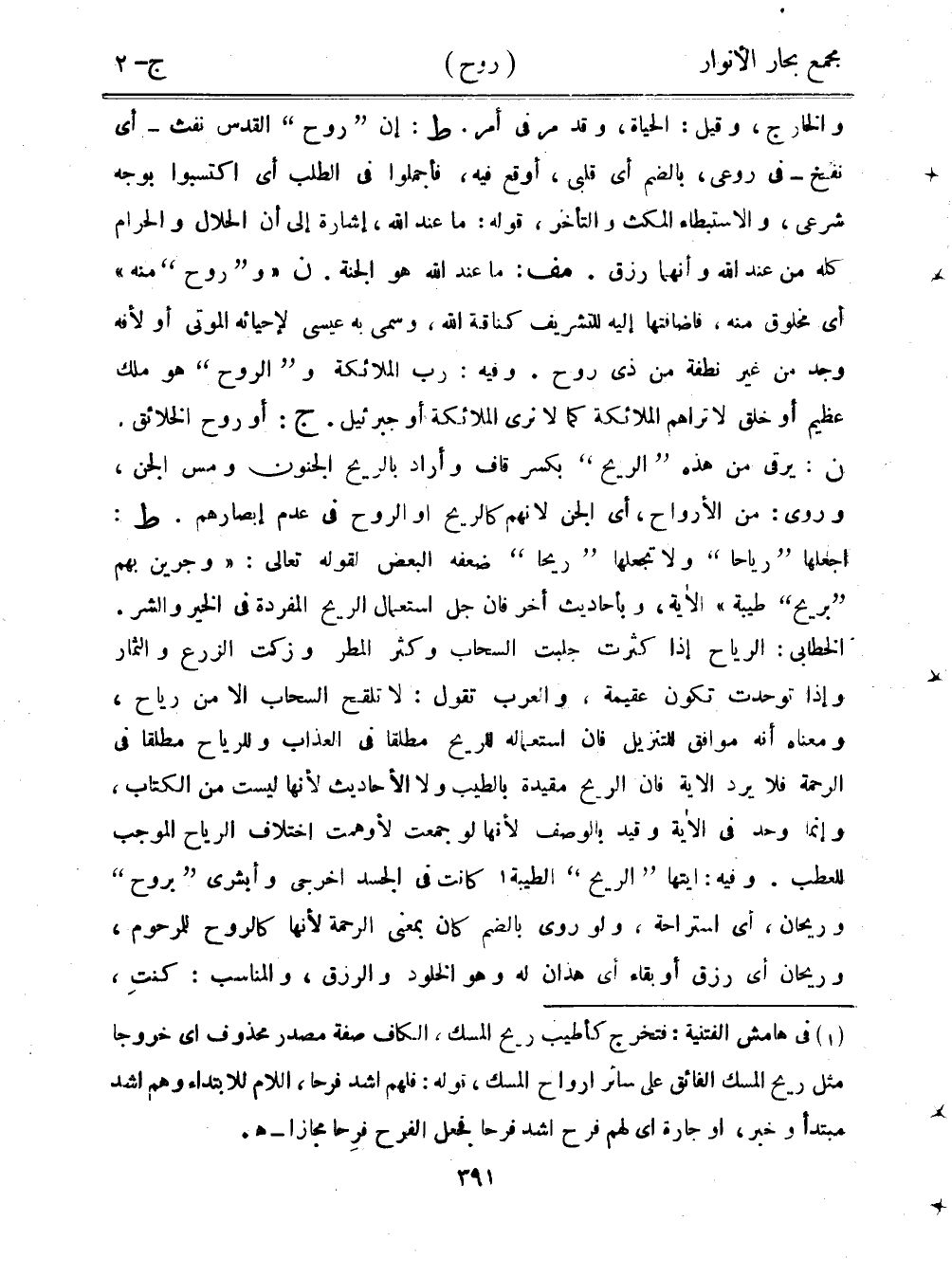والخارج، وقيل: الحياة، وقد مر في أمر. ط: إن "روح" القدس نفث - أي نفخ - في روعي، بالضم أي قلبي، أوقع فيه، فأجملوا في الطلب أي اكتسبوا بوجه شرعي، والاستبطاء المكث والتأخر، قوله: ما عند الله، إشارة إلى أن الحلال والحرام كله من ند اله وأنهما رزق. مف: ما عند الله هو الجنة. ن "و"روح" منه" أي مخلوق منه، فإضافتها إليه للتشريف كناقة الله، وسمي به عيسى لإحيائه الموتى أو لأنه وجد من غير نطفة من ذي روح. وفيه: رب الملائكة و"الروح" هو ملك عظيم أو خلق لا تراهم الملائكة كما لا نرى الملائكة أو جبرئيل. ج: أو روح الخلائق. ن: يرقى من هذه "الريح" بكسر قاف وأراد بالريح الجنون ومس الجن، وروى: من الأرواح، أي الجن لأنهم كالريح أو الروح في عدم إبصارهم. ط اجعلها "رياحا" ولا تجعلها "ريحا" ضعفه البعض لقوله تعالى: "وجرين بهم "بريح" طيبة" الآية، وبأحاديث أخر فإن جل استعمال الريح المفردة في الخير والشر. الخطابي: الرياح إذا كثرت جلبت السحاب وكثر المطر وزكت الزرع والثمار وإذا توحدت تكون عقيمة، والعرب تقول: لا تلقح السحاب إلا من رياح، ومعناه أنه موافق للتنزيل فإن استعماله للريح مطلقًا في العذاب وللرياح مطلقًا في الرحمة فلا يرد الآية فإن الريح مقيدة بالطيب ولا الأحاديث لأنها ليست من الكتاب، وإنما وحد في الآية وقيد بالوصف لأنها لو جمعت لأوهمت اختلاف الرياح الموجب للعطب. وفيه: آيتها "الريح" الطيبة كانت في الجسد اخرجي وأبشري "بروح" وريحان، أي استراحة، ولو روى بالضم كان بمعنى الرحمة لأنها الروح للمرحوم، وريحان أي رزق أو بقاء أي هذان له وهو الخلود والرزق، والمناسب: كنت،