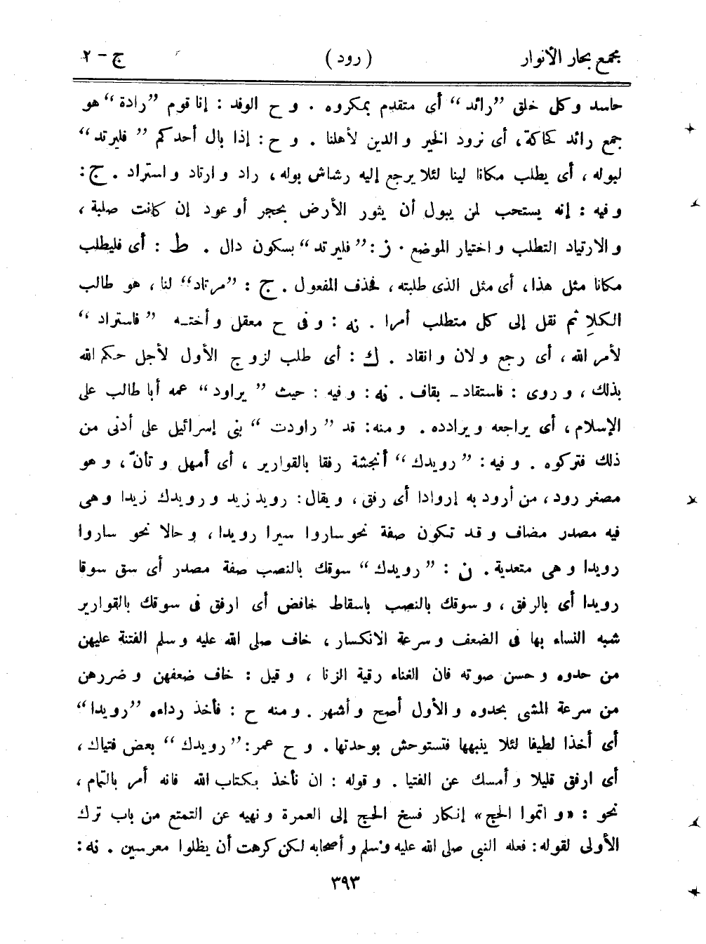 حاسد وكل خلق "رائد" أي متقدم بمكروه. وح الوفد: إنا قوم "رادة" هو جمع رائح كحاكة، أي نرود الخير والدين لأهلنا. وح: إذا بال أحدكم "فليرتد" لبوله، أي يطلب مكانا ًلينًا لئلا يرجع إليه رشاش بوله، راد وارتاد واستراد. ج: وفيه: إنه يستحب لمن يبول أن يثور الأرض بحجر أو عود إن كانت صلبةن والارتياد التطلب واختيار الموضع. ز: "فليرتد" بسكون دال. ط: أي فليطلب مكانًا مثل هذا، أي مثل الذي طلبته، فحذف المفعول. ج: "مرتاد" لنا، هو طالب الكلا ثم نقل إلى كل متطلب أمرًا. نه: وفي ح معقل وأخته "فاستراد" لأمر الله، أي رجع ولان وانقاد. ك: أي طلب لزوج الأول لأجل حكم الله بذلك، وروى: فاستقاد- بقاف. نه: وفيه: حيث "يراود" عمه أبا طالب على الإسلام، أي يراجعه ويرادده. ومنه: قد "راودت" بني إسرائيل على أدنى من ذلك فتركوه. وفيه: "رويدك" أنجشة رفقًا بالقوارير، أي أمهل وتأن، وهو مصغر رود، من أرود به إروادا أي رفق، ويقال: رويد زيد ورويدك زيدًا وهي فيه مصدر مضاف وقد تكون صفة نحو ساروا سيرًا رويدًا، وحالًا نحو ساروا رويدًا وهي متعدية. ن: "رويدك" سوقك بالنصب صفة مصدر أي سق سوقًا رويدًا أي بالرفق، وسوقك بالنصب بإسقاط خافض أي أرفق في سوقك بالقوارير شبه النساء بها في الضعف وسرعة الانكسار، خاف صلى الله عليه وسلم الفتنة عليهن من حدوه وحسن صوته فإن الغناء رقية الزنا، وقيل: خاف ضعفهن وضررهن من سرعة المشي بحدوه والأول أصح وأشهر. ومنه ح: فأخذ رداءه "رويدًا" أي أخذا لطيفًا لئلا ينبهها فتستوحش بوحدتها. وح عمر: "رويدك" بعض فتياك، أي ارفق قليلًا وأمسك عن الفتيا. وقوله: أن نأخذ بكتاب الله فإنه أمر بالتمام، نحو:"وأتموا الحج" إنكار فسخ الحج إلى العمرة ونهيه عن التمتع من باب ترك الأولى لقوله: فعله النبي صلى الله عليه وسلم وأصحابه لكن كرهت أن يظلوا معرسين. نه: